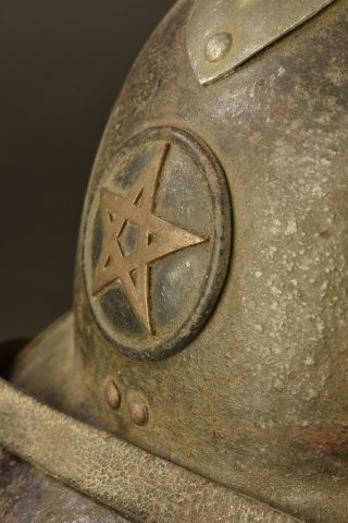 Casque Adrian modèle 26 réutilisé par la police marocaine. Peinture extérieur quasiment absente, rondache en fer avec étoile chérifienne rapportée en laiton. Le bord est recouvert... en savoir plus