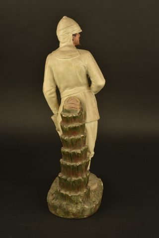 Statuette en plâtre, représentant un soldat belge, en tenue tropicale d’époque. Tenant dans sa main un parchemin marqué Congo Belge Fumez la Congo. Couleur à 90%. Réalisé par l’artiste TH KOOB à Anvers. Hauteur 49 cm. A noter une certaine usure et patine de la pièce. Photos supplémentaires sur www.aiolfi.com. Additional photos on www.aiolfi.com.