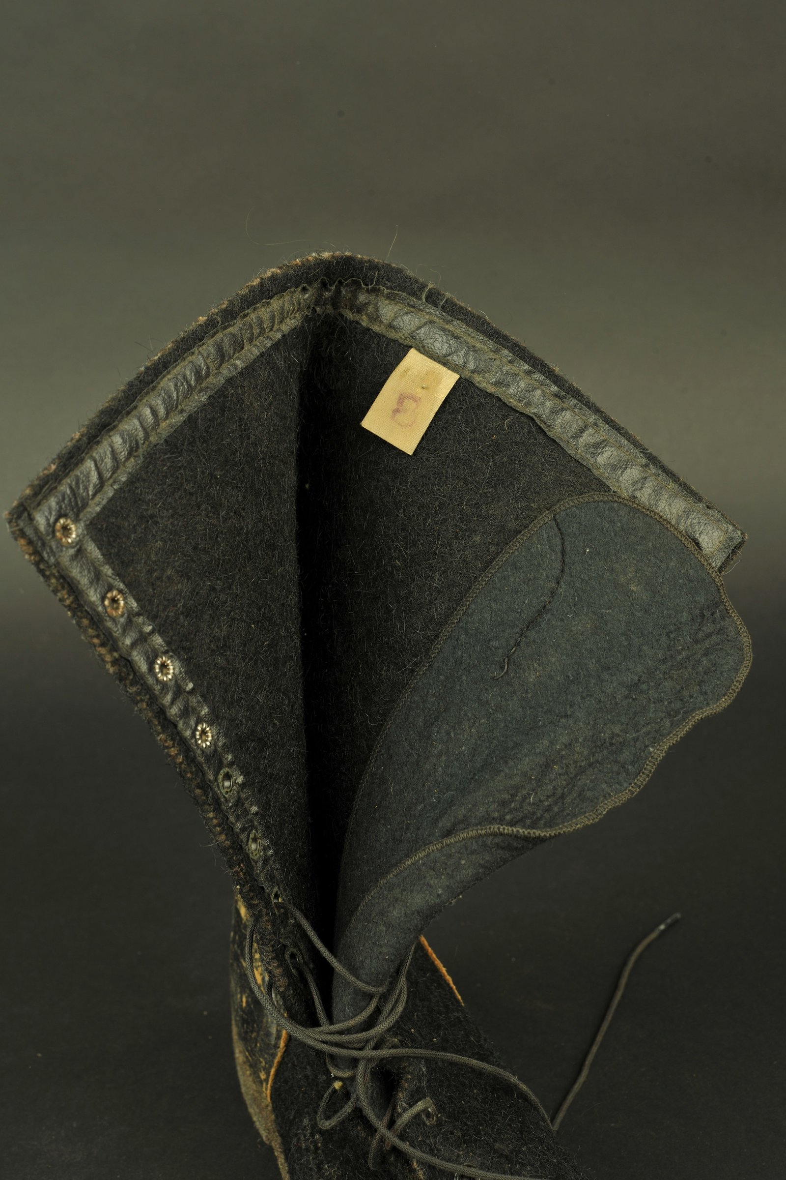 En épais lainage noir et renfort arrière en cuir noir. Huit œillet et quatre crochet de laçage. Semelles en épaisse feutrine grise. Etiquette interne indiquant une taille 8. Paire homogène.... en savoir plus