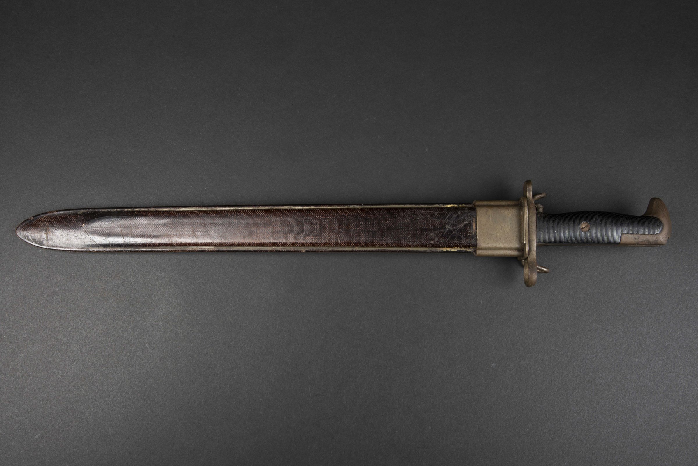 Plaquettes complètes. Lame complète dans sa longueur, et dans sa couleur d’origine à 60%, présentant quelques tâches d’oxydation. Fabrication US PAL 1942. Fourreau complet,... en savoir plus
