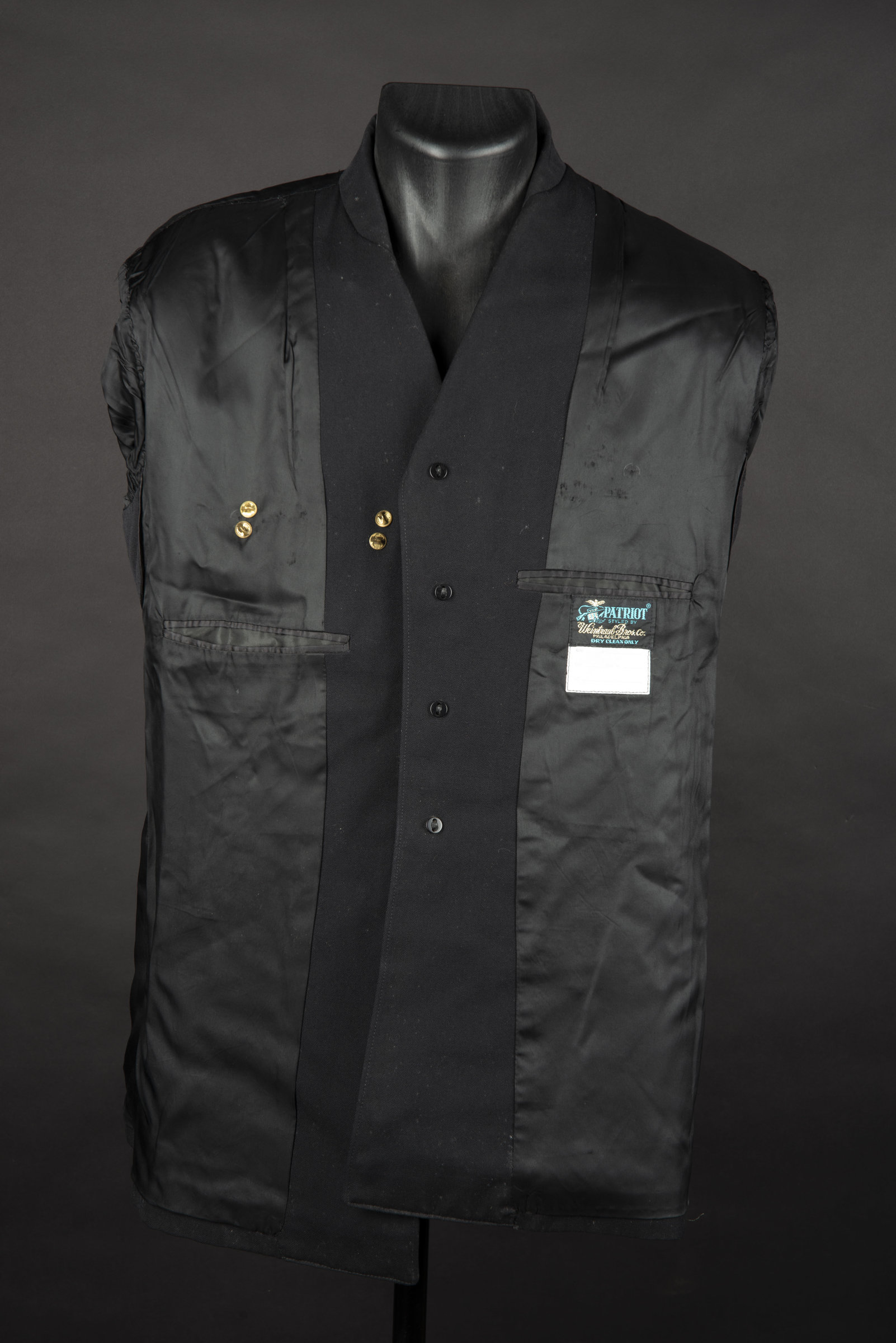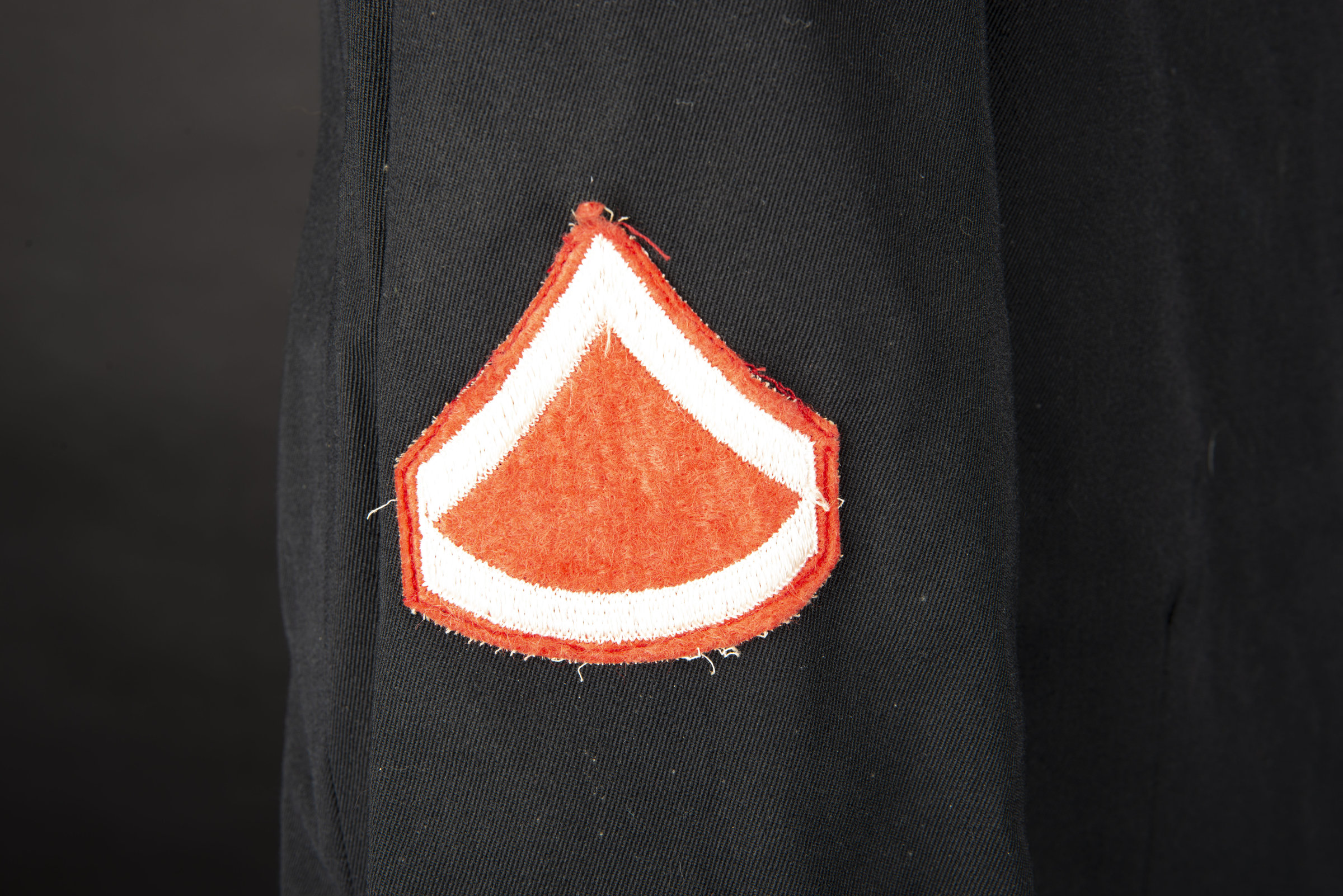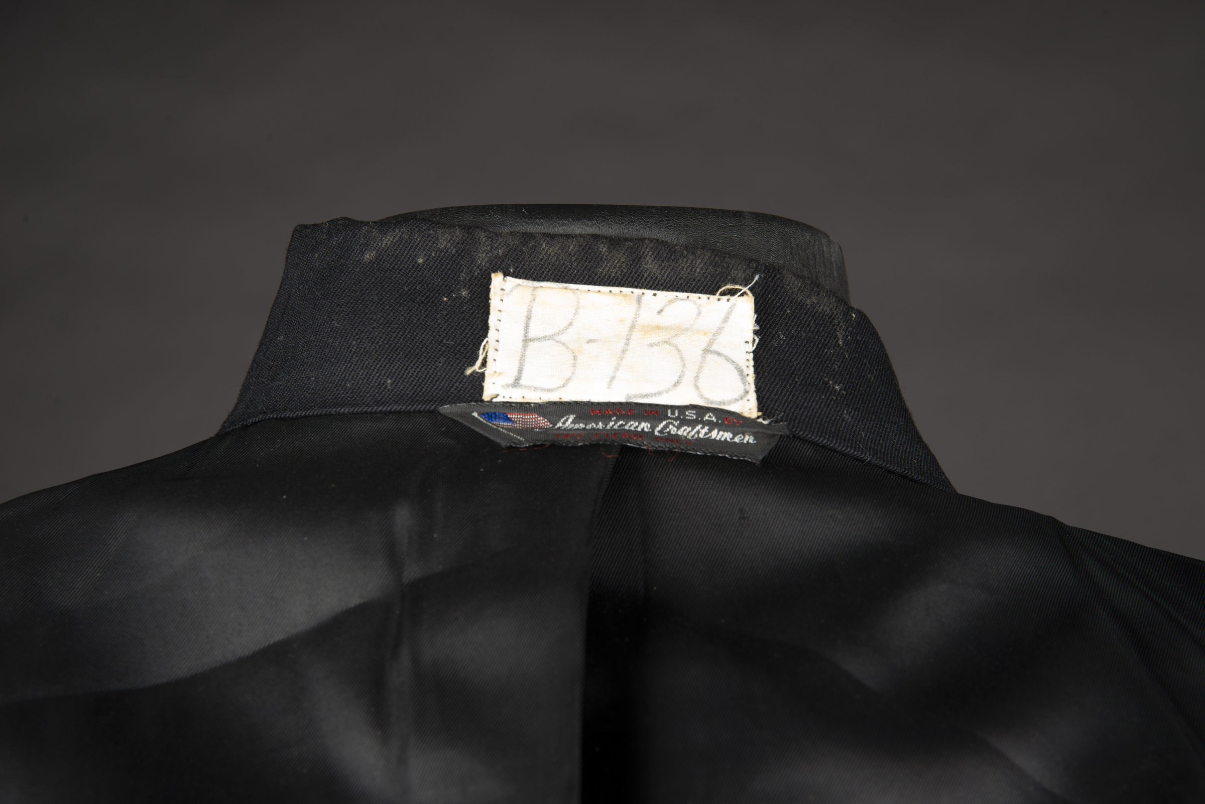 En tissu noir. Tous les boutons sont présents. Disques de col troupe en métal doré. Crest au niveau des pattes d’épaule. Fourragère présente. Grades de manche et patch montés machine. Six barrettes de rubans de décoration. Etiquette dans le col marquée B-136. Fabrication Weintraub Bros Co Philadelphia. A noter une légère usure et patine de la pièce. Photos supplémentaires sur www.aiolfi.com. Additional photos on www.aiolfi.com.