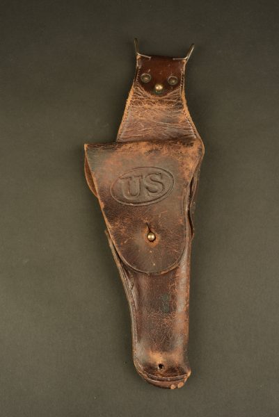 En cuir marron, bien marqué US sur la face avant. Aucuns marquages fabricant visible. Rallonge en cuir typique de la cavalerie, complète. Un œillet métallique est manquant. Le crochet arrière est présent. A noter une certaine usure et patine de la pièce. Photos supplémentaires sur www.aiolfi.com. Additional photos on www.aiolfi.com.