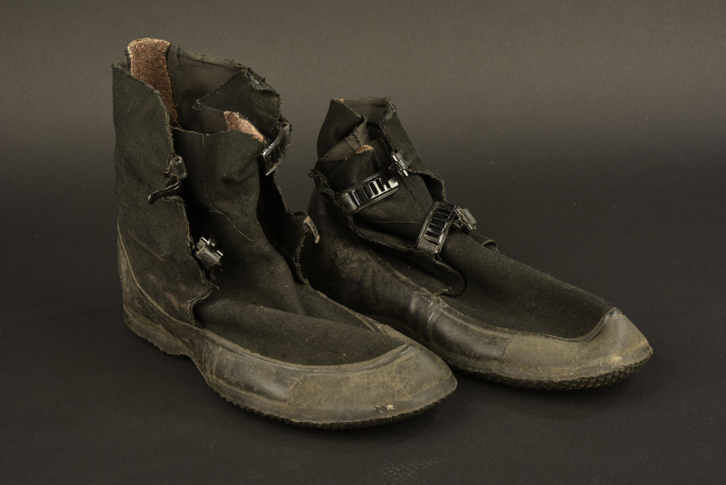 Semelles en caoutchouc enveloppantes, et feutre noir. Deux crochets de fixation. Sans marquages visibles, taille 9M. Visiblement découpées. A noter une certaine usure et patine des pièces,... en savoir plus