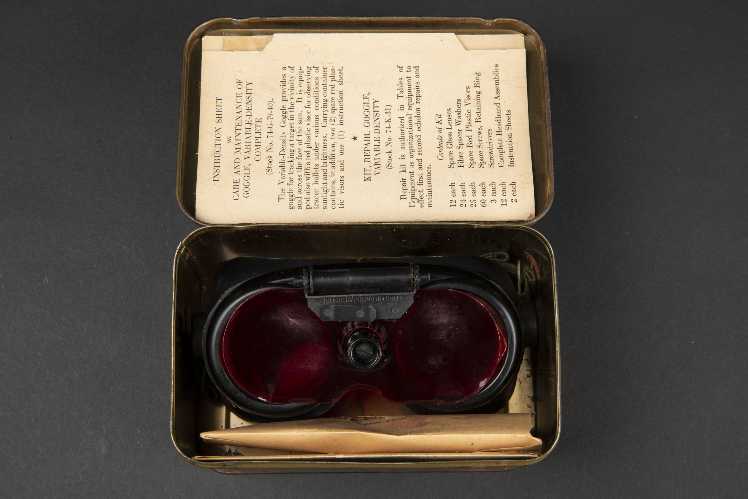 Boite en métal complète, quelques marques d’usures et d’oxydation sur l’ensemble de la boite. Reste d’étiquette marquée Goggle sur le pourtour de la boite. Notice d’utilisation présente sous le couvercle. Lunettes complètes, élastique souple, filtre rouge complet, fabrication Filters By Polaroid Corp. Deux filtres rouges présents dans leur emballage d’origine. Un emballage est partiellement déchiré. A noter une certaine patine de la pièce. Photos supplémentaires sur www.aiolfi.com. Additional photos on www.aiolfi.com.