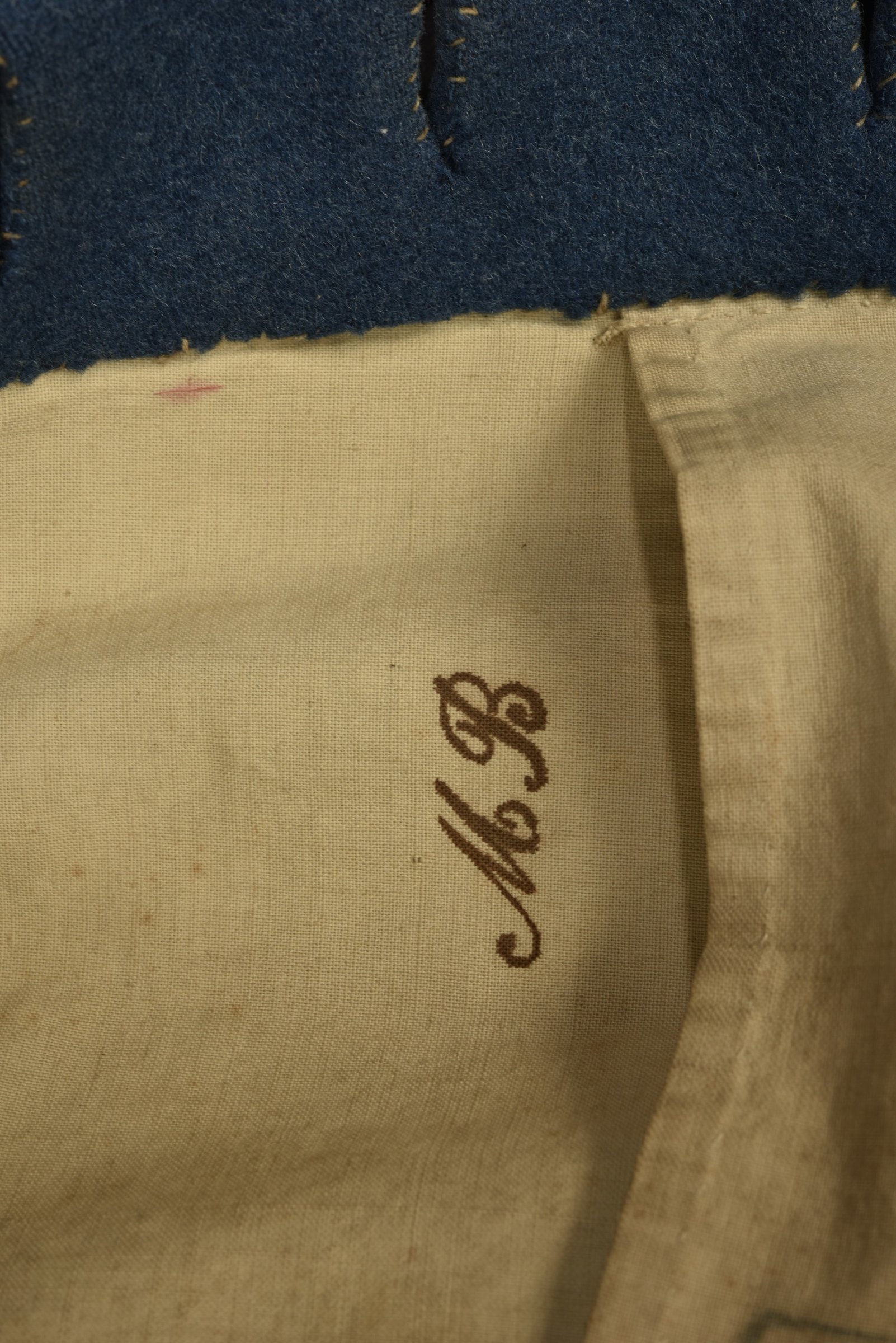 Veste courte en drap bleu de ciel au couleurs très fraîches, fermée d’une rangée de 9 boutons demi sphériques en étain, collet droit avec pattes de collet en drap garance type chasseur... en savoir plus
