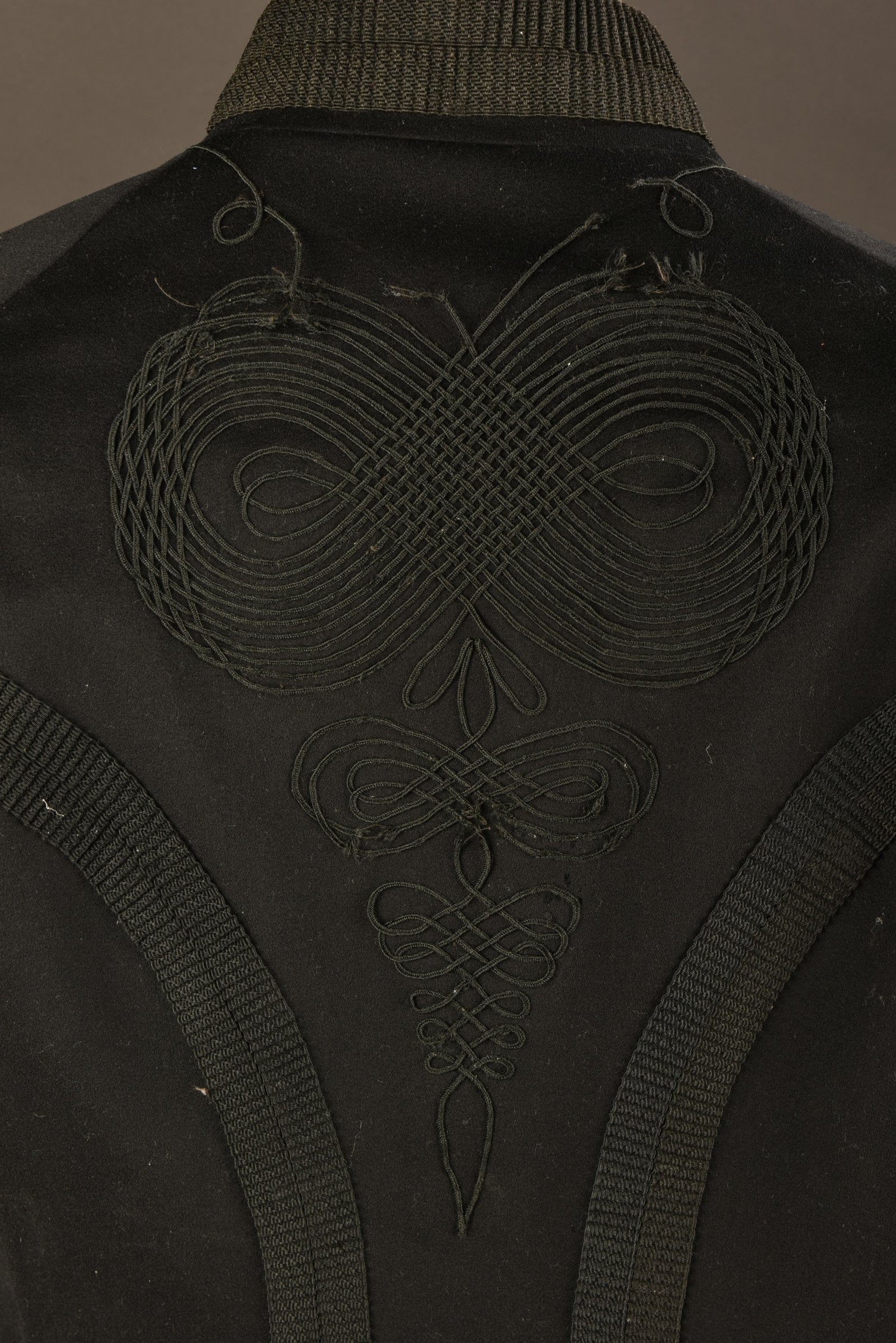 En drap noir, brandebourg noir complet. La majorité des olives sont présentes. Nœud papillon dans le dos en soutache noir. Fabrication sur une base de Dolman de Général. Barrette de... en savoir plus