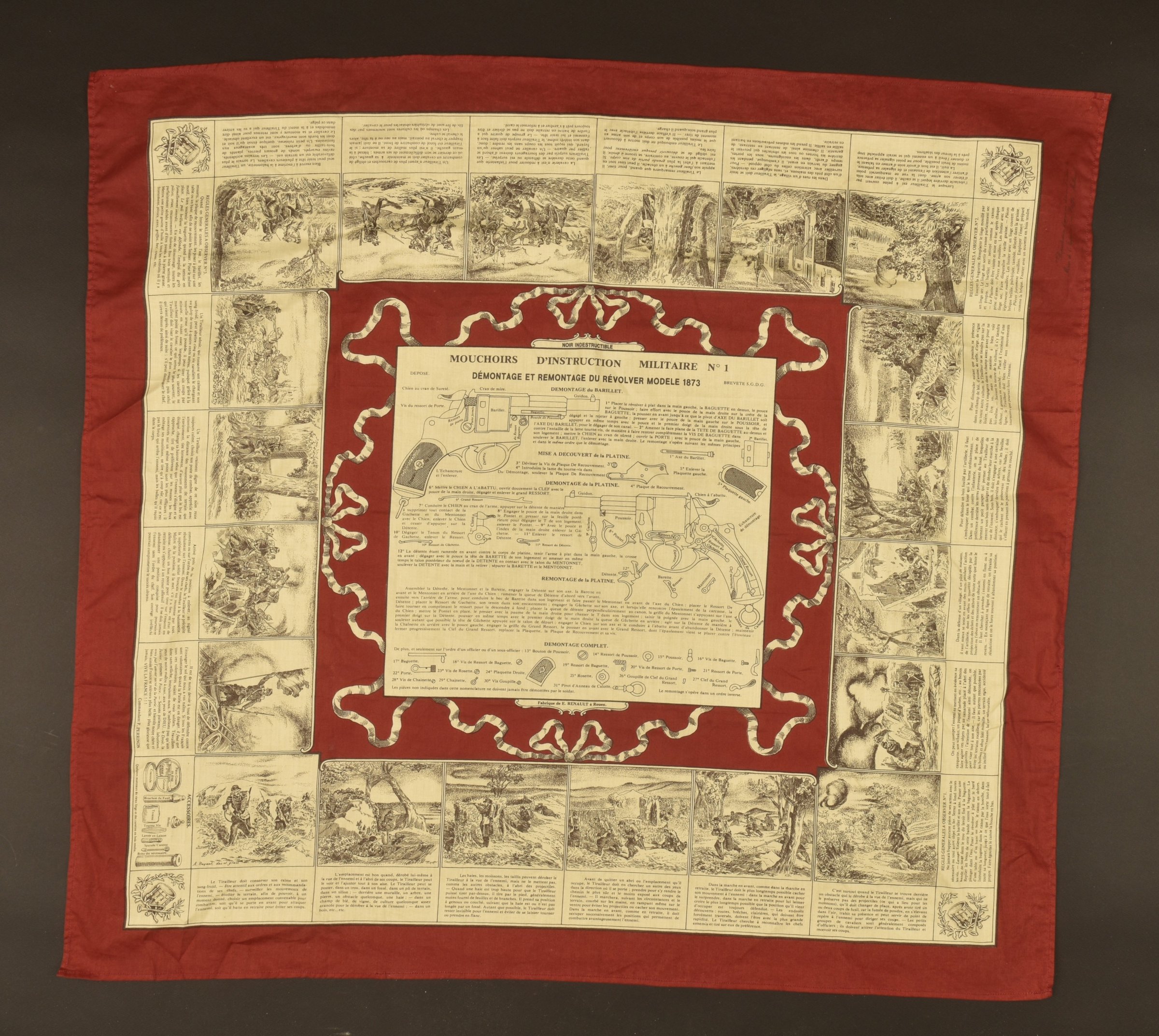 Lot de deux mouchoirs d’instruction en reproduction, mouchoir numéro 3 de cavalerie et mouchoir numéro 1 pour le démontage et le remontage du revolver 1873. Photos supplémentaires sur... en savoir plus