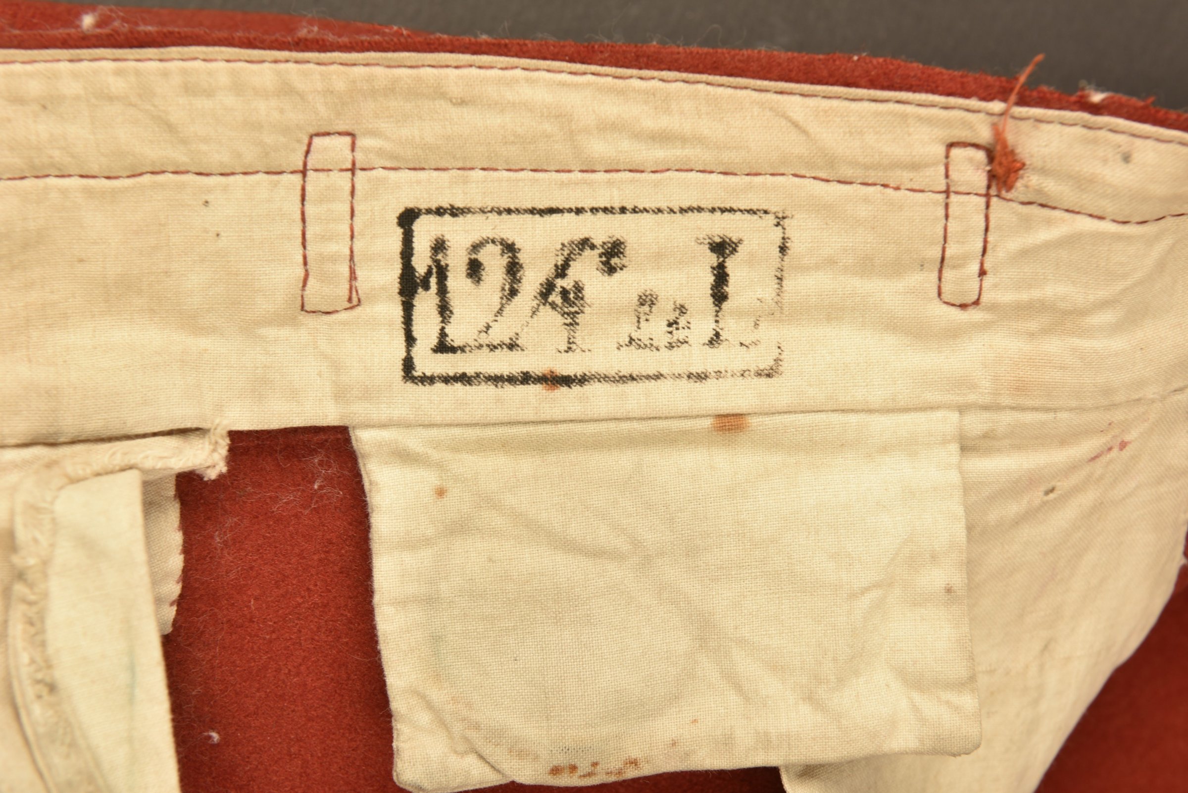 Pantalon troupe modèle 1867 en drap garance, doublure en drap blanc avec de nombreux marquages dont affectation au 124ème de ligne et cachet de réception daté 1895, martingale à... en savoir plus