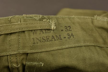 En tissu coton HBT, couleur OD7. Tous les boutons sont présents et estampillés d’étoiles. Bavette anti-gaz présente. Taille W 32 L 34. Etiquette du fabricant Blue Jay MFG CO, datée du... en savoir plus