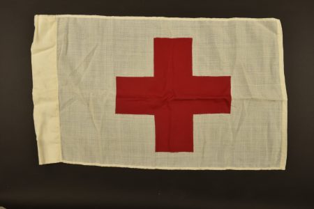 En tissu coton blanc, croix rouge rapportée, bi face. La fixation au mat est présente, et doublé d’une lanière en cuir. Dimensions 45 x 75 cm. A noter une légère usure de la pièce.... en savoir plus