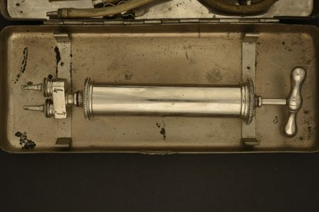 Boite en métal, couleur argent. Fermeture incomplète. Seringue présente, les tuyaux sont incomplets et cassés. Certains accessoires sont manquants. Photocopie d’une partie de la notice... en savoir plus