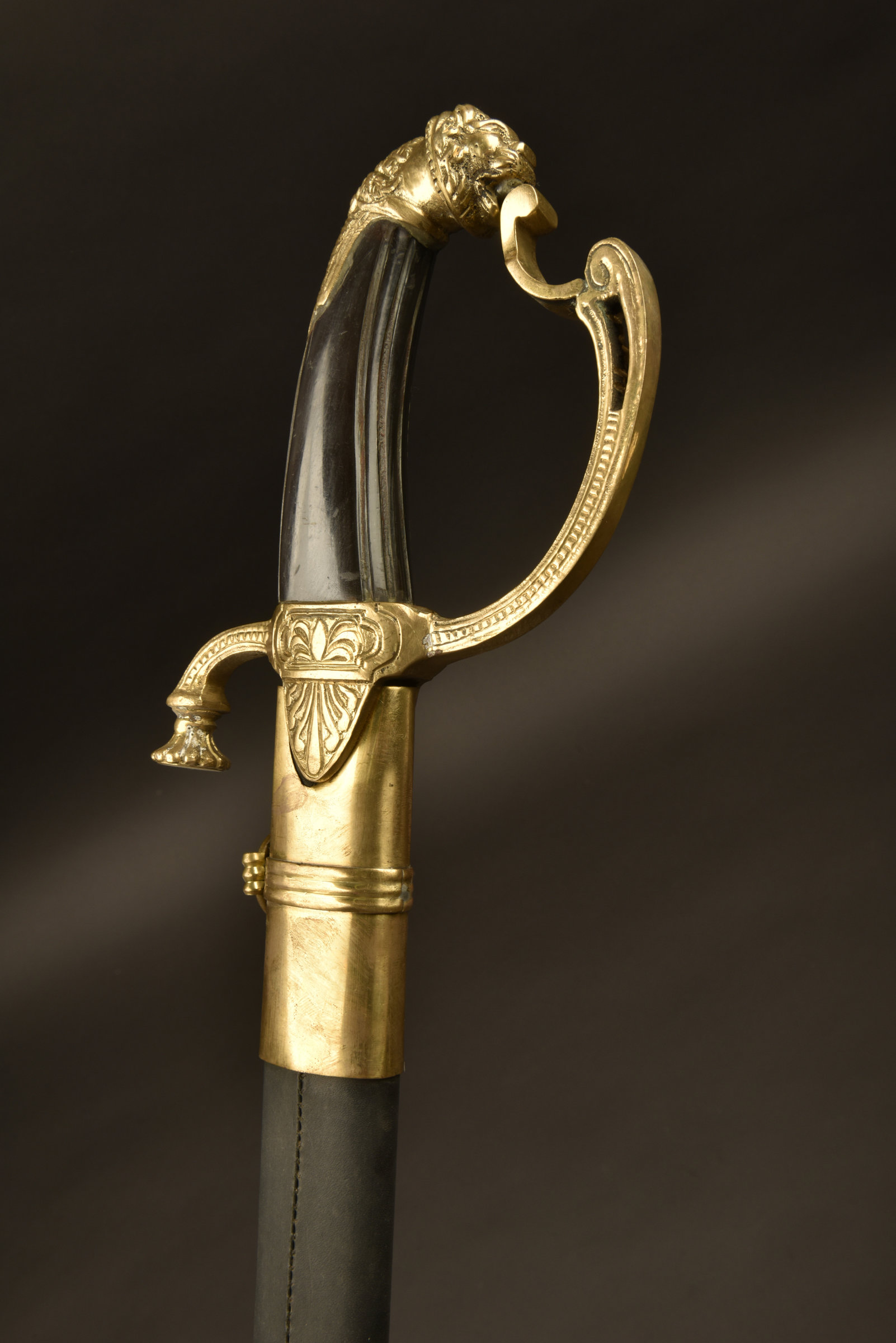 Très belle reconstitution d’un sabre des gardes d’honneur du premier Empire. Fourreau complet, belle lame. A noter une légère usure et patine de la pièce. Cette arme a participé à de très nombreux tournages. Elle sera remise à l’acquéreur une attestation de provenance et d’authenticité de la société Maratier. Photos supplémentaires sur www.aiolfi.com. Additional photos on www.aiolfi.com.