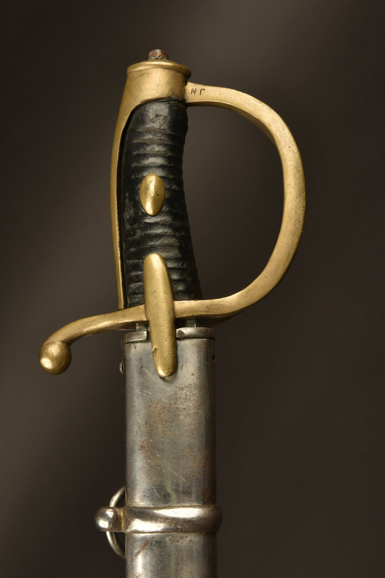 Très belle reconstitution d’un sabre troupe de la cavalerie légère, du premier Empire. Fourreau complet, belle lame. A noter une légère usure et patine de la pièce. Cette arme a participée à de très nombreux tournages. Elle sera remise à l’acquéreur une attestation de provenance et d’authenticité de la société Maratier. Photos supplémentaires sur www.aiolfi.com. Additional photos on www.aiolfi.com.