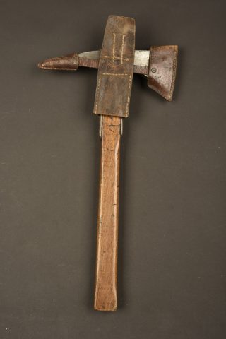 Manche en bois, modèle court. Partie métallique légèrement oxydée, sans marquages visibles. Gousset complet en cuir marron, sans marquages visibles. A noter une certaine usure et patine de la... en savoir plus
