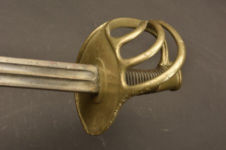 Lame légèrement courbe en acier à un seul tranchant dite Montmorency larges pans creux arrondi. Marquages illisibles au dos de la lame. Monture en laiton fondu doré, garde à 3 branches, 1... en savoir plus