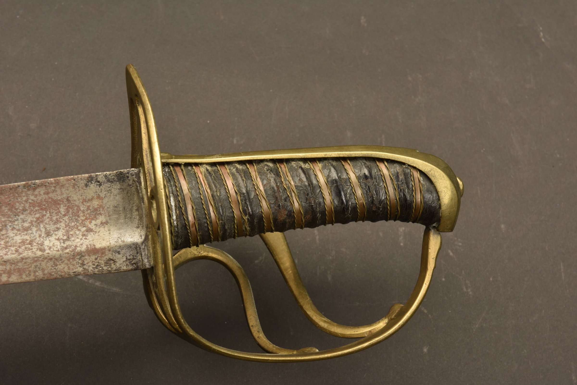 Poignée en cuir, double rangée de filigrane or. Garniture en laiton. Lame oxydée. Longueur 69 cm. Sans marquages visibles. A noter une certaine usure et oxydation de la pièce. Photos... en savoir plus