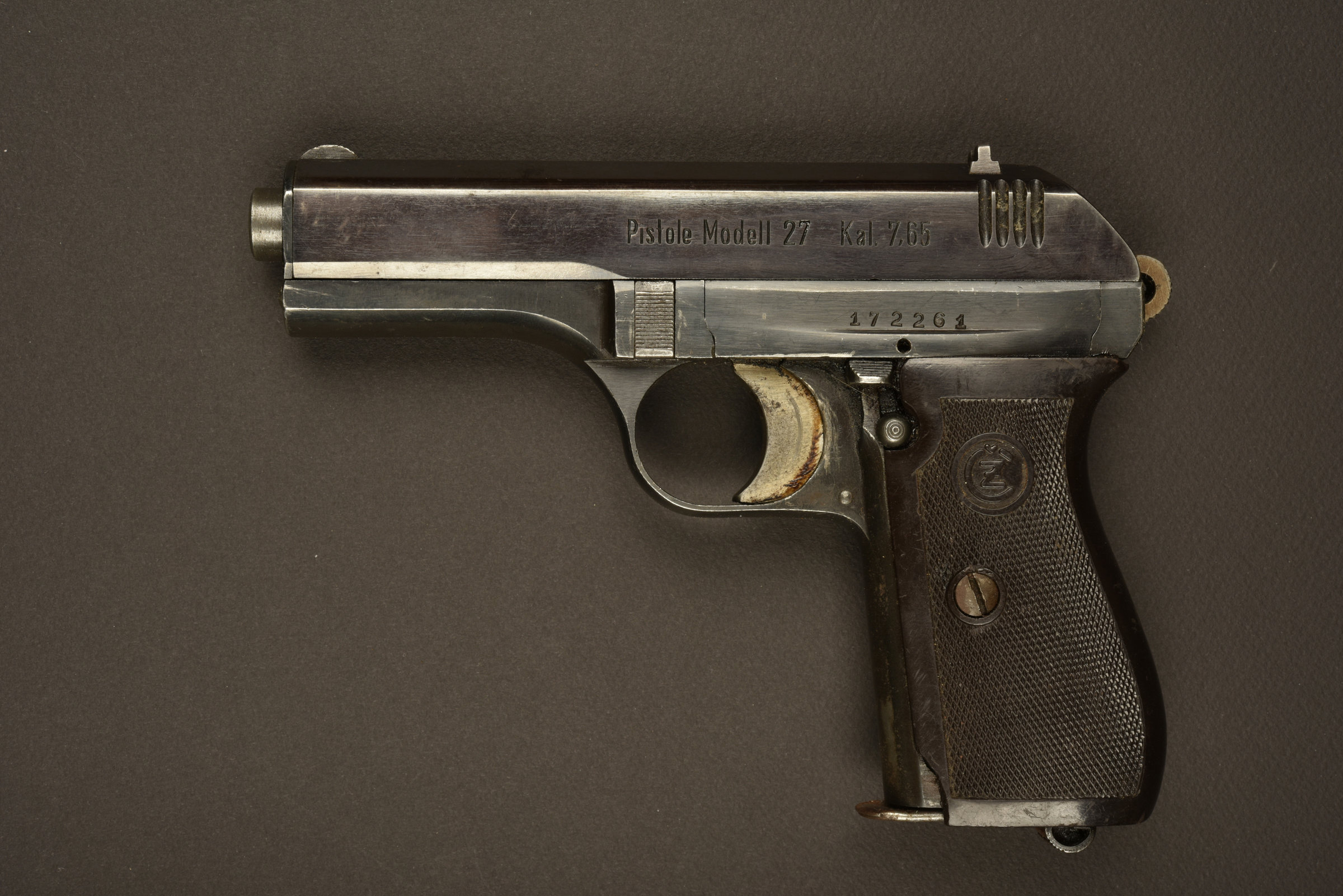 Plaquettes complètes, et marquées CZ. Chargeur présent. Numéro 172261, calibre 7,65mm. Chargeur bien marqué P MOD 27 148. Fabrication Bohmische Waffenfabrik AG in Prag. Nombreux poinçons AN.... en savoir plus