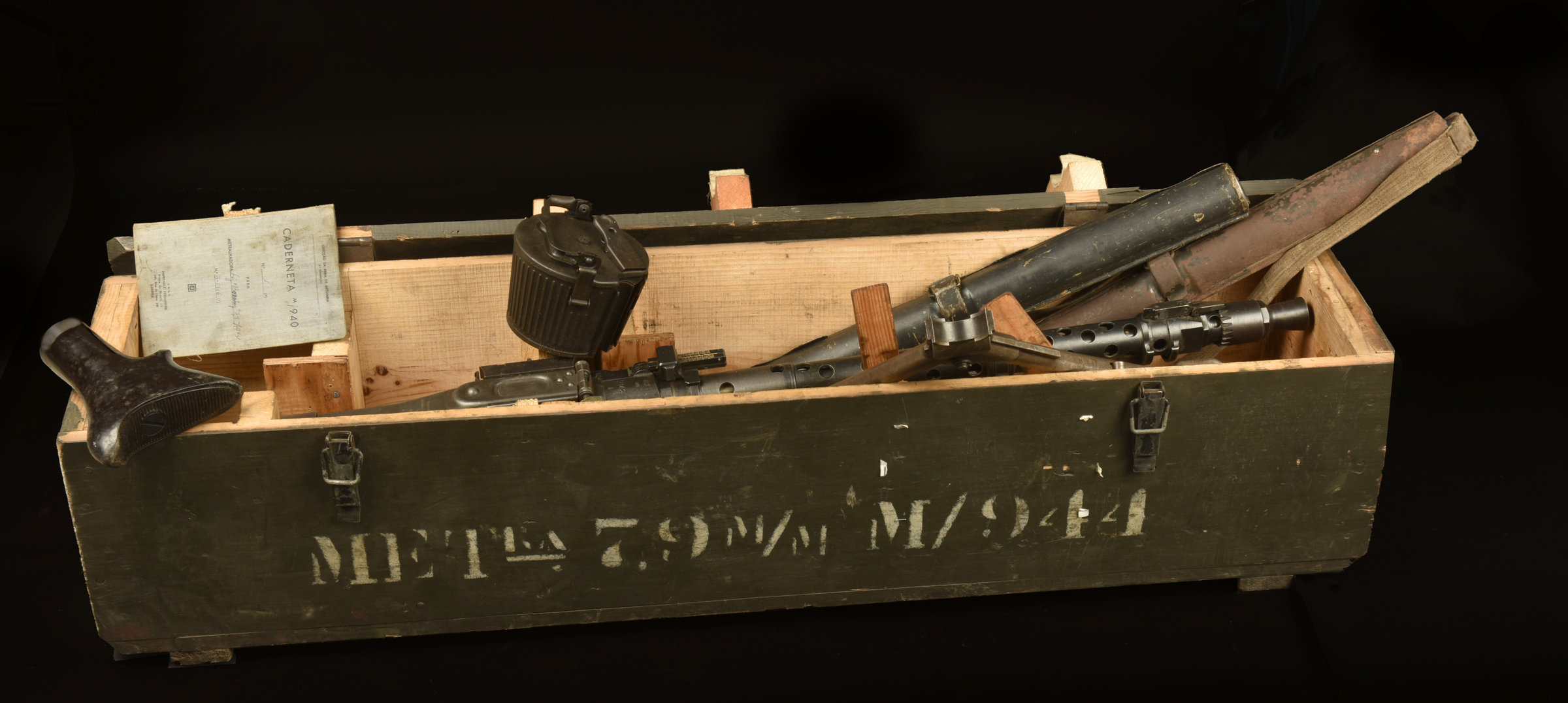 Crosse en bakélite noire, marquée 2142B. Bipied présent ainsi que le cache flamme. Fabrication DOT 43, numéro 2142b. Arme au numéro. Chargeur tambour complet. Livret présent marqué... en savoir plus