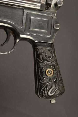CALIBRE 7,63X25. Numéro 502634. Longueur 28 cm. CATEGORIE C-9. C96 BOLO avec plaquettes gravées Mauser, rebronzé, Découpe de 6 cm sous le canon quelques rayures et traces de manipulation. Arme... en savoir plus