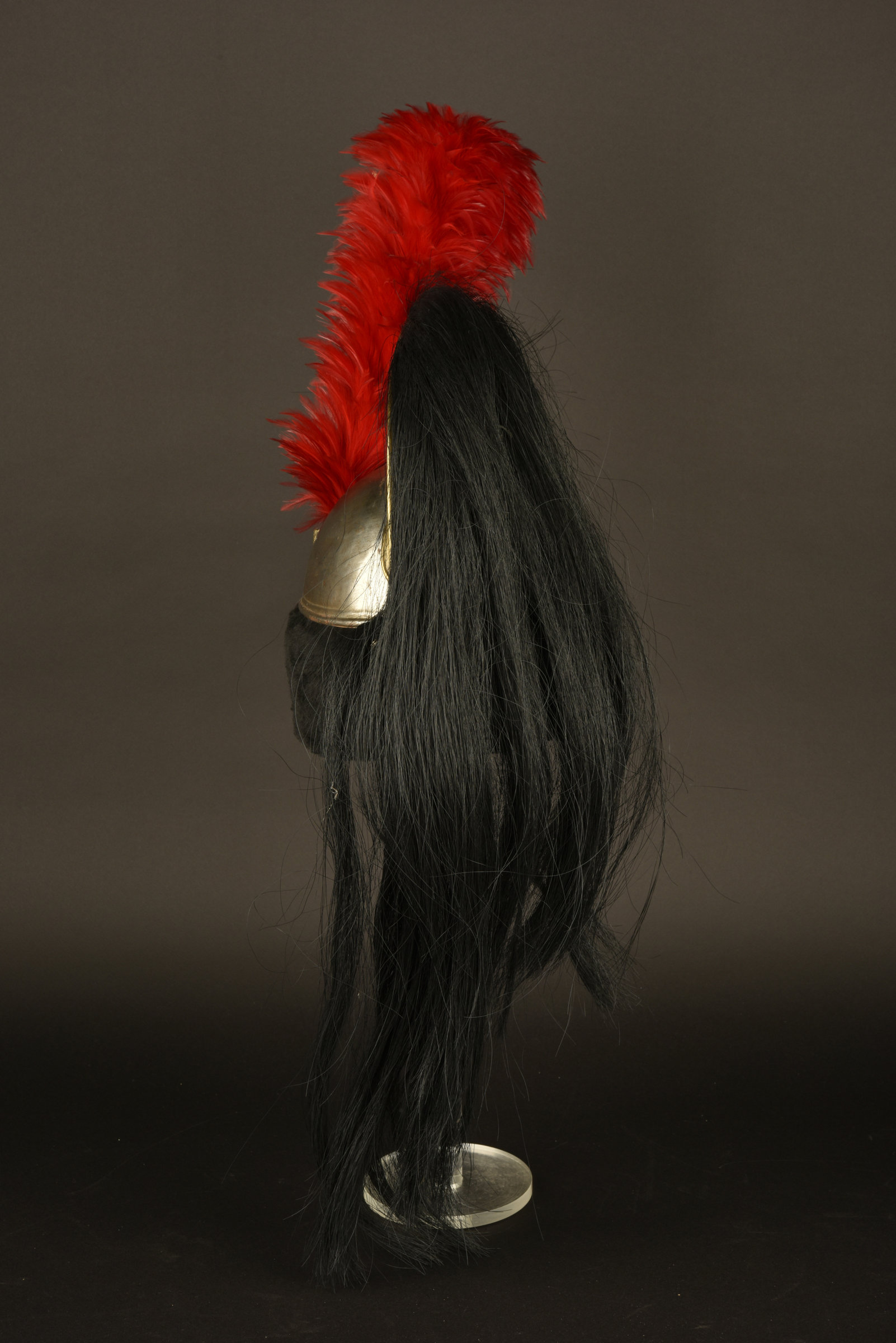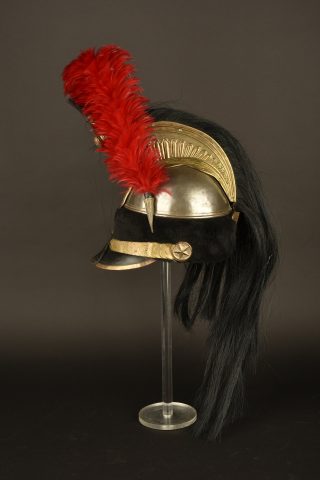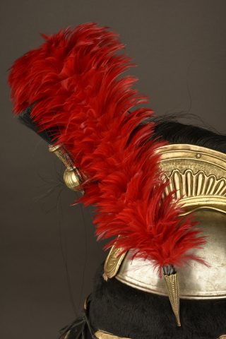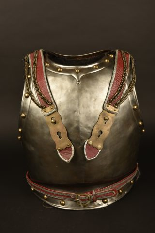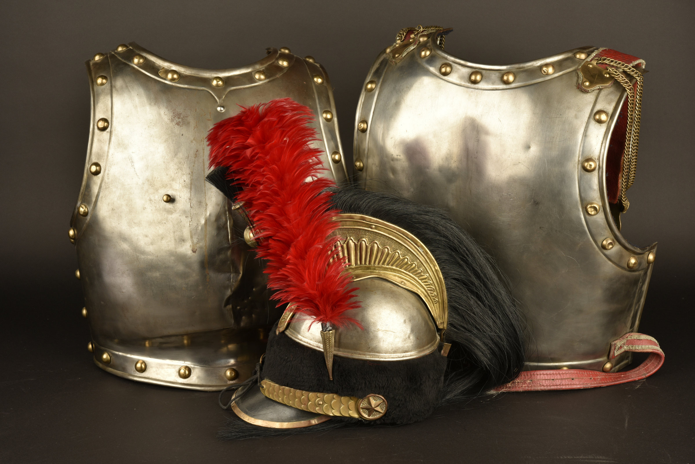 Ensemble fabriqué de matériaux composites destiné au cinéma. La matelassure du dos de la cuirasse comporte encore l’étiquette nominative d’attribution à l’un des comédiens ainsi que l’étiquette des établissements Maratier. Ces deux pièces, ont été réalisées pour la reconstitution de la charge d’Eylau, qui est l’une des scènes principales du film Colonel Chabert réalisé par Yves Angelo en 1994. Le rôle titre était tenu par Gérard Depardieu. Ce film a bénéficié de six nominations aux Césars, dont celle des meilleurs costumes. Il sera remis à l’acquéreur une attestation de provenance et d’authenticité de la société Maratier. Etat d’usage. Photos supplémentaires sur www.aiolfi.com. Additional photos on www.aiolfi.com.