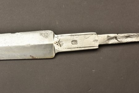 Lame rhombique à double tranchant jusqu’à 91,5 cm de ricasso, le ricasso de 6 cm de long avec les troisième et quatrième côtés avec poinçon de forge et décor de poinçon. La soie est... en savoir plus