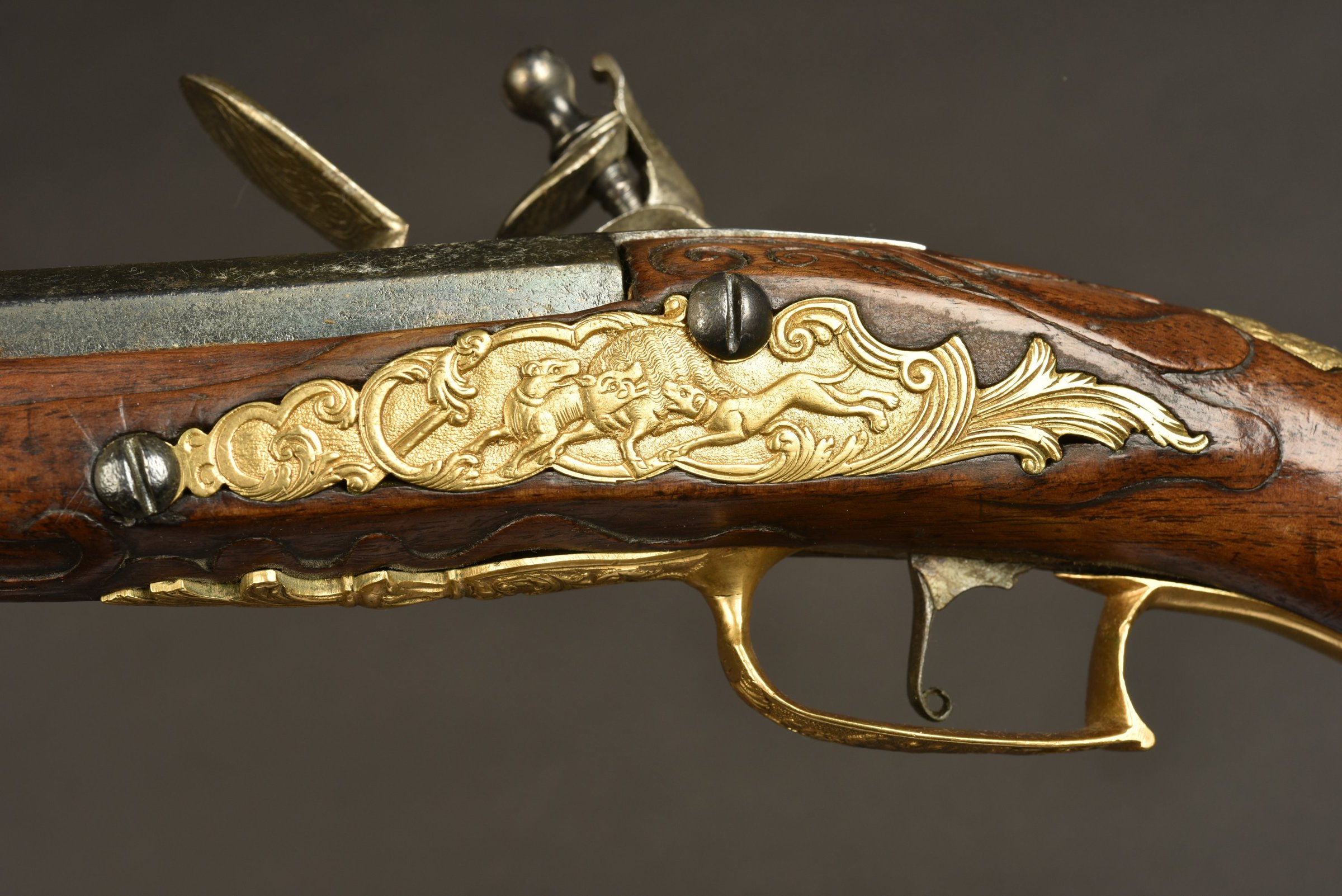 Pistolet à silex Daniel Nodt, probablement Karlsbad vers 1740/60. Oactgonal sur balustre dans un canon rond passant 27,5 cm avec noyau lisse en calibre : 14mm. Surface du canon bleuie encore... en savoir plus