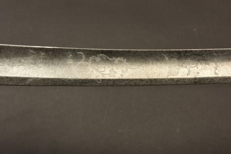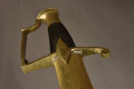 Sabre d’officier de cavalerie légère période Consulat. Poignée en ébène quadrillée en losanges avec bordures à gouttières. Monture en laiton doré, calotte plate à 2 bourrelets. Oreillon en forme de navette. Lame courbe à dos plat et un pan creux. Gravures de motifs végétaux stylisés. Fourreau en laiton à 2 anneaux bronze, sur 2 bracelets rehaussés de motifs végétaux. dard asymétrique.