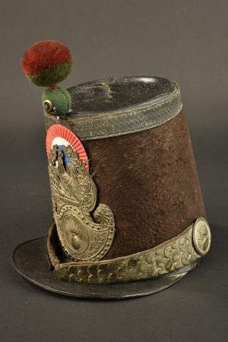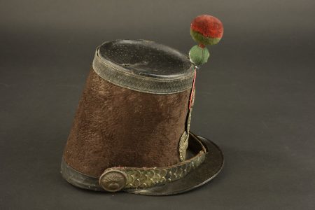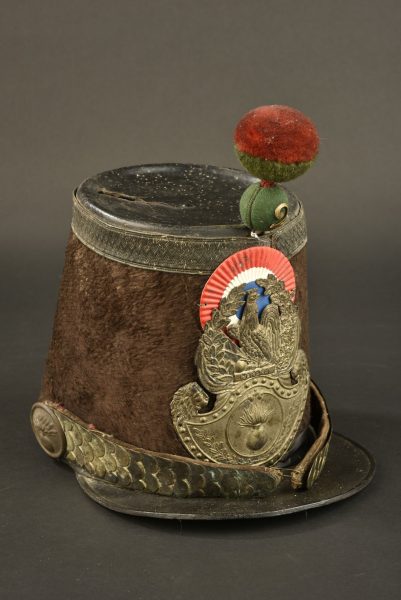 Fut en carton recouvert d’un velours taupé, bourdalou en cuir noir, galon d’argent tissé de 2cm. Plateau en cuir accidenté, jugulaire en laiton. Plaque ornée des têtes de lion surmontées du coq tenant dans ses pattes la devise Liberté. Visière en cuir, dessous peint en vert, coiffe en cuir à dents de loup. Cocarde métallique tricolore peinte, pompon vert et rouge. Hauteur arrière 20cm. Etat II+