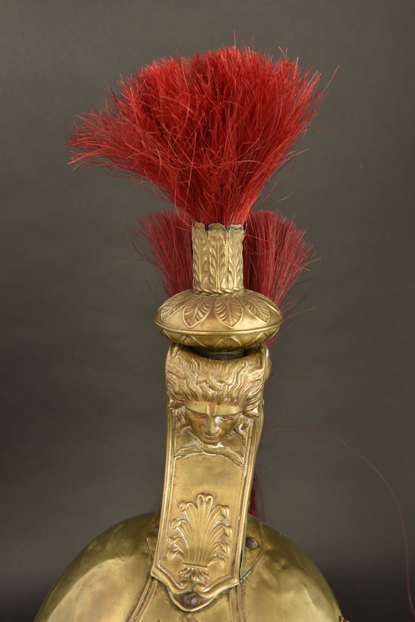 Casque modèle 1825 entièrement fabriqué en laiton, jugulaires à gourmettes doublées de cuir, celui-ci est postérieur, rosaces en laiton représentant le soleil rayonnant. Crinière en crins... en savoir plus