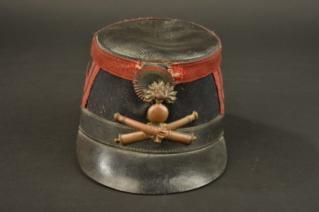 Fut en carton recouvert de drap bleu foncé, bourdalou de cuir, galons cul de dés garance de l’artillerie. Visière de forme ronde en cuir noir, insigne en laiton estampé du modèle de... en savoir plus