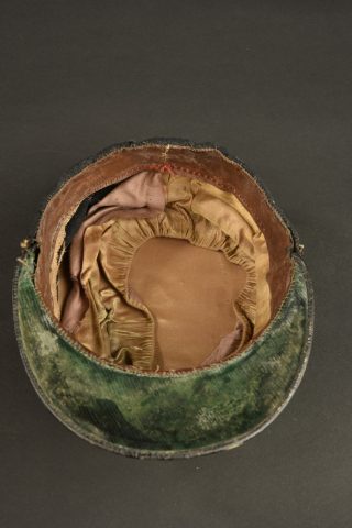 En drap noir, bandeau de feuilles de chênes réalisés en cannetille, galons argentés, hongroise sur le calot Fausse jugulaire en cuir surmontant une fausse jugulaire argent. Visière en cuir... en savoir plus