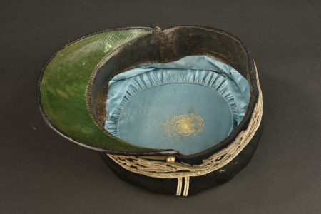En drap noir, bandeau de feuilles de chênes réalisés en cannetille, galons argentés, hongroise sur le calot Fausse jugulaire retenue par deux boutons grelots lisses. Visière en cuir noir... en savoir plus