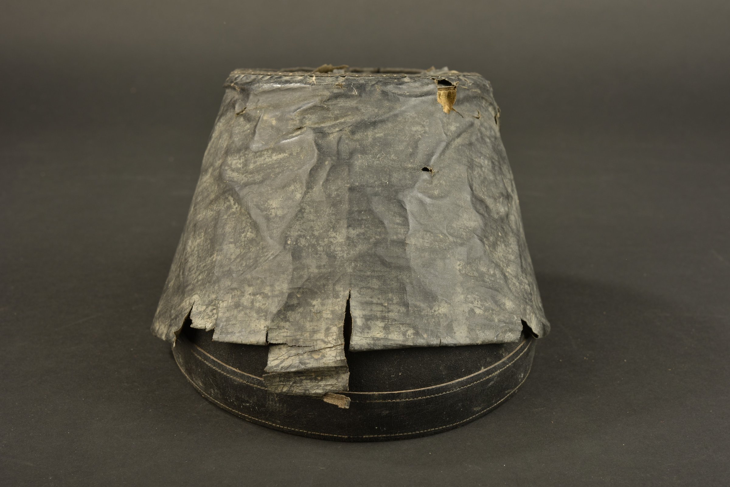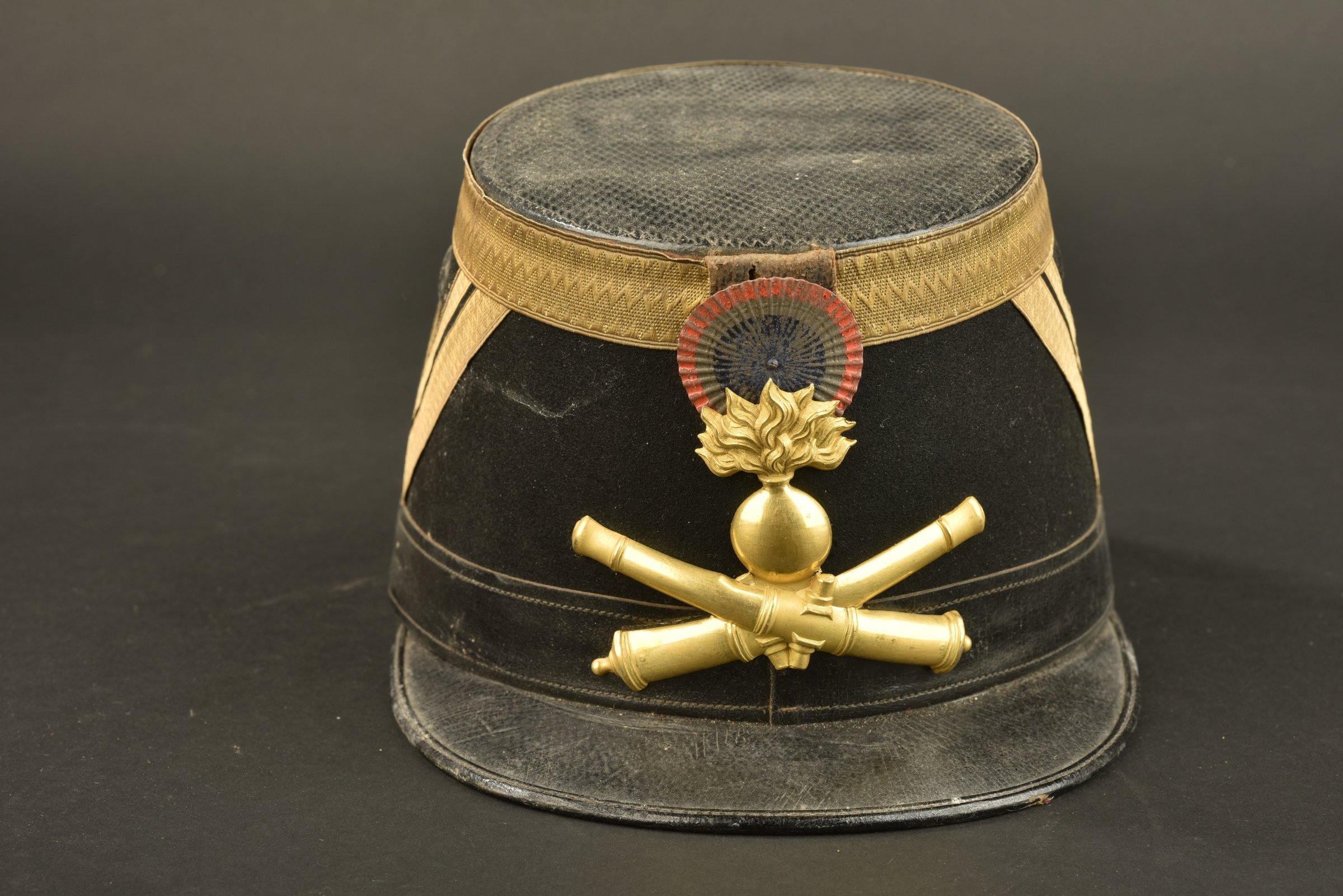 Shako d’officier d’artillerie, attributs en métal, cocarde tricolore, galon d’officier façon lézarde. Intérieur en soie bleu, déchirée. Basane en cuir noire bordée d’un liseré doré. Visière en cuir à dessous en maroquin vert. Couvre shako en toile imperméabilisé, orné à l’avant d’une grenade d’infanterie peinte. A noter une certaine usure et déchirure des pièces.