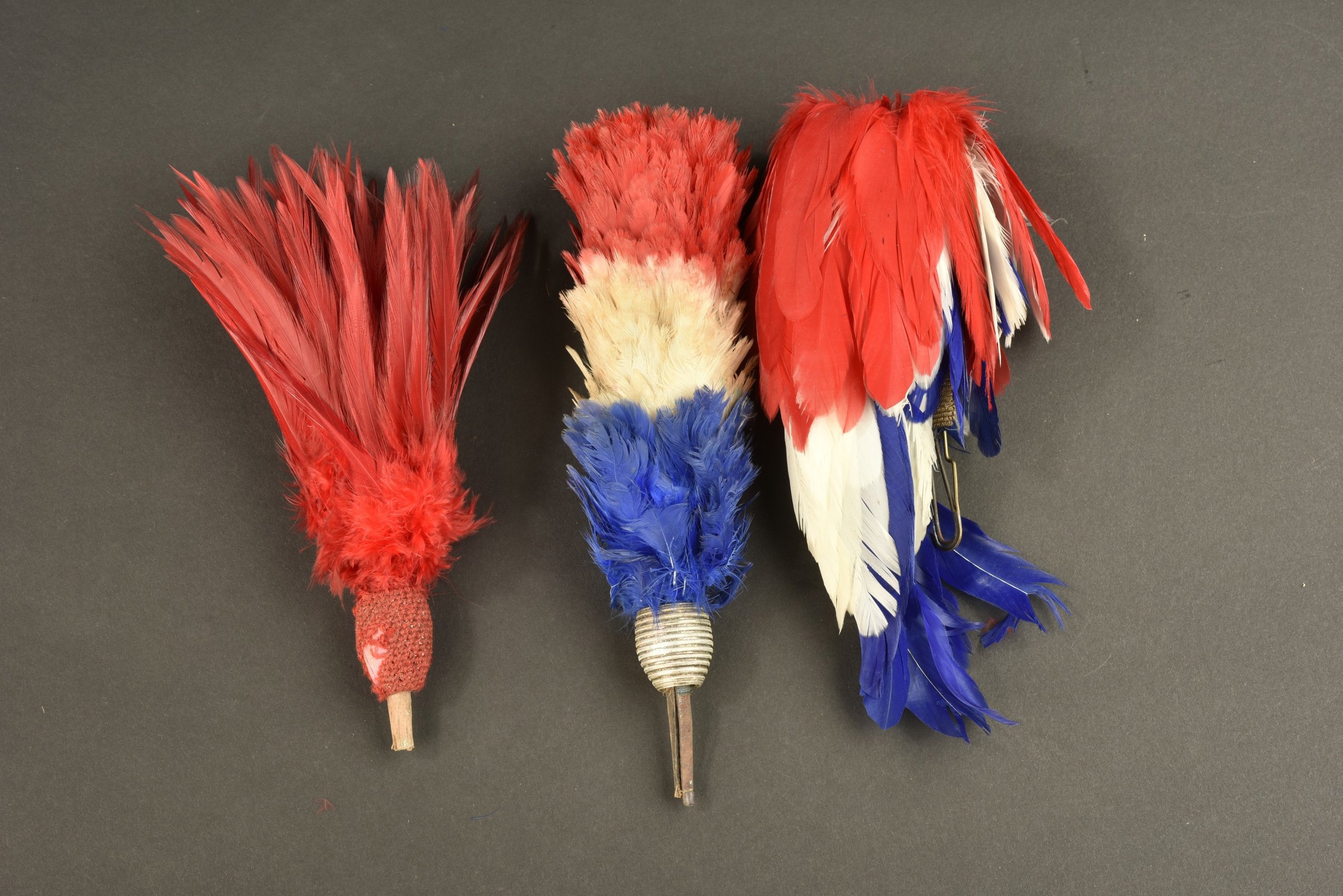 Un plumet tricolore pour shako de grande tenue, olive dorée. Un plumet tricolore, olive argenté. Un plumet rouge en plume de coq, olive rouge. Etat II+