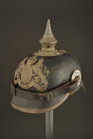 Casque à pointe bavarois modèle 1915 toutes garnitures fer. Plaque aux armes de la Bavière, fixation par pattes repliables, l’une d’elle cassée. Pointe amovible à baïonnette.... en savoir plus