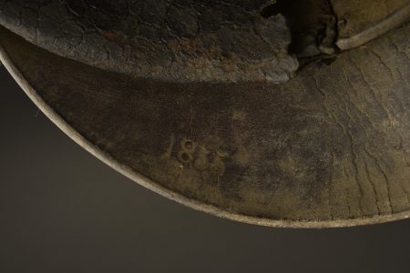 Casque à chenille Raupenhelm bavarois modèle 1861 pour troupes à pied, Infanterie, Jäger et Schützen. Bombe en cuir bouilli avec un bordalou. Plaque avec chiffre du roi Maximilien sur soleil... en savoir plus