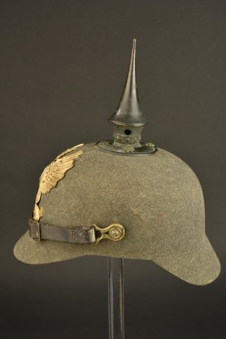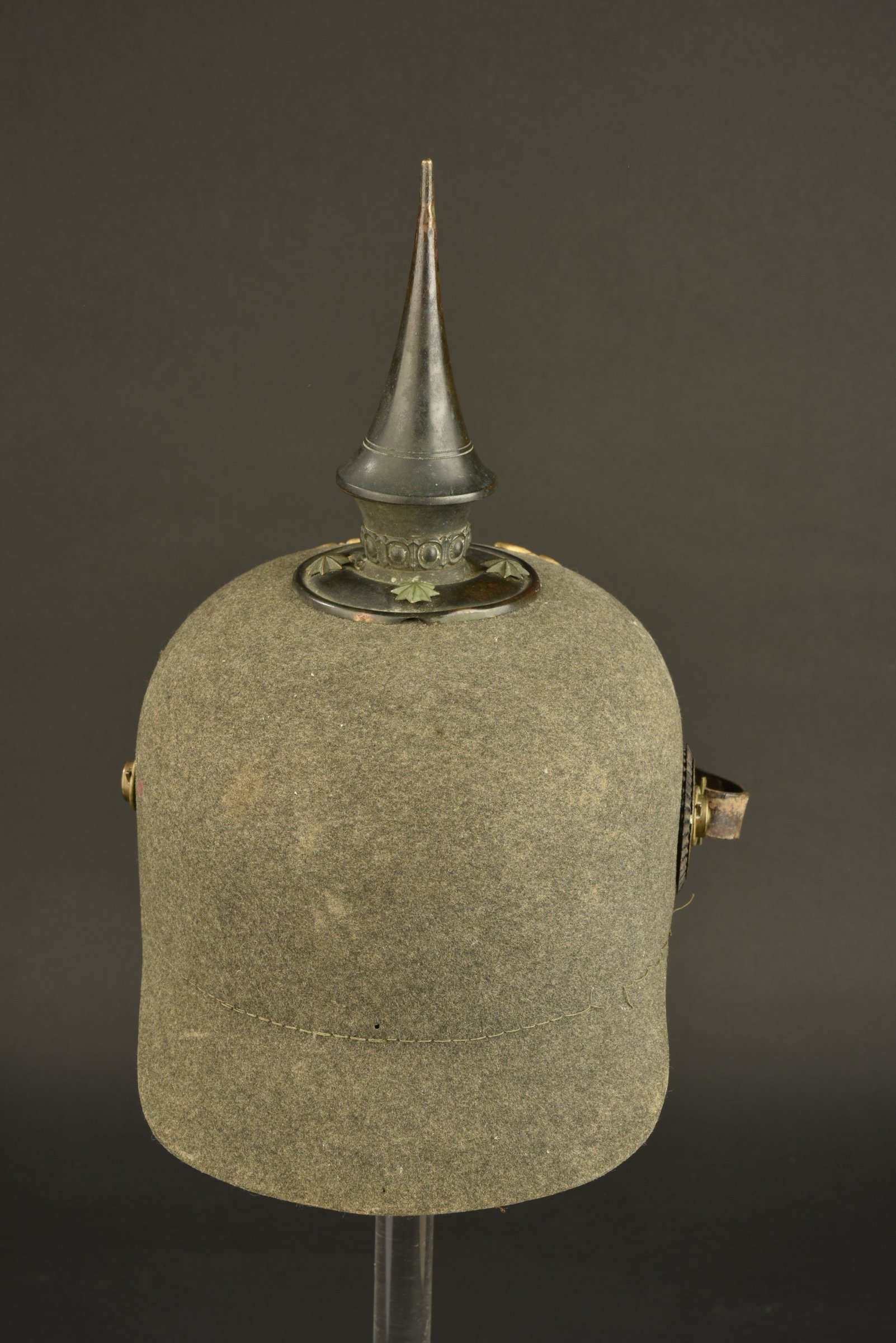 Joli casque à pointe en feutre de sous officier supérieur de réserve. Très belle plaque type officier, aigle à couronne ajourée avec belle dorure et croix de réserve en maillechort type... en savoir plus