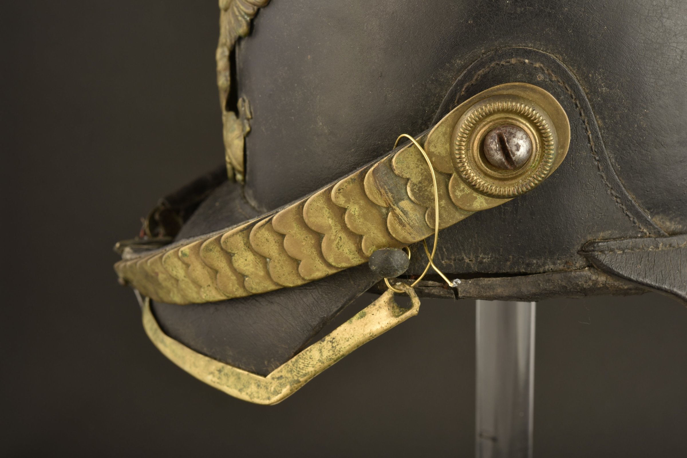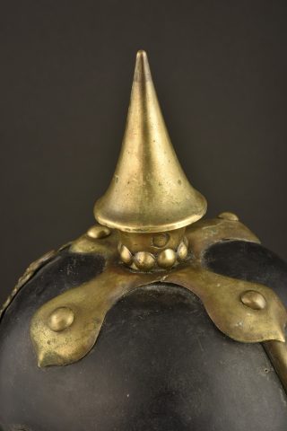 Casque à pointe troupe modèle 1860. Bombe haute, pointe fixe avec Perlring sur embase trèfle fixée par vis têtes rondes laiton et écrous à pontets. Jonc de renfort arrière avec 2 rivets... en savoir plus