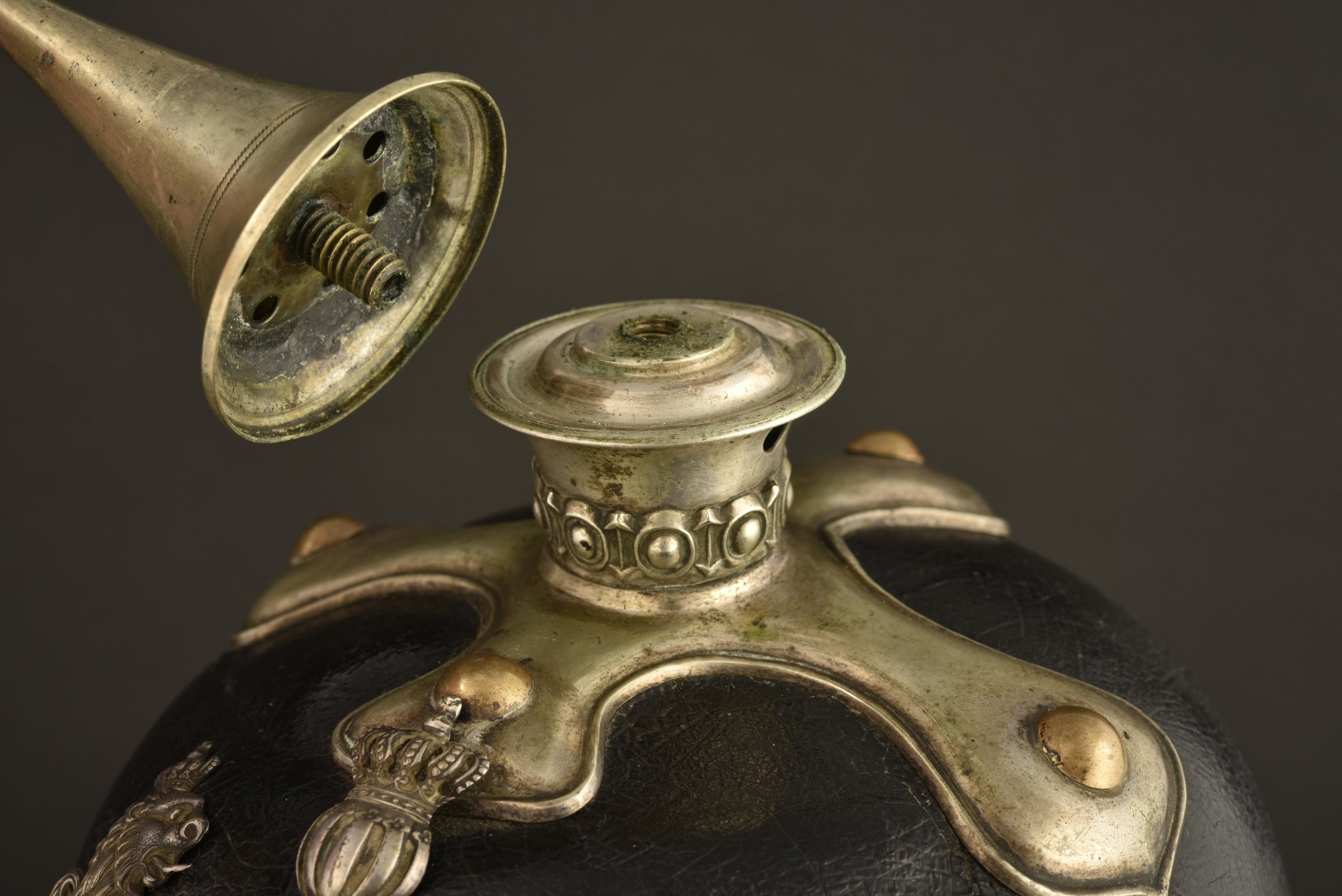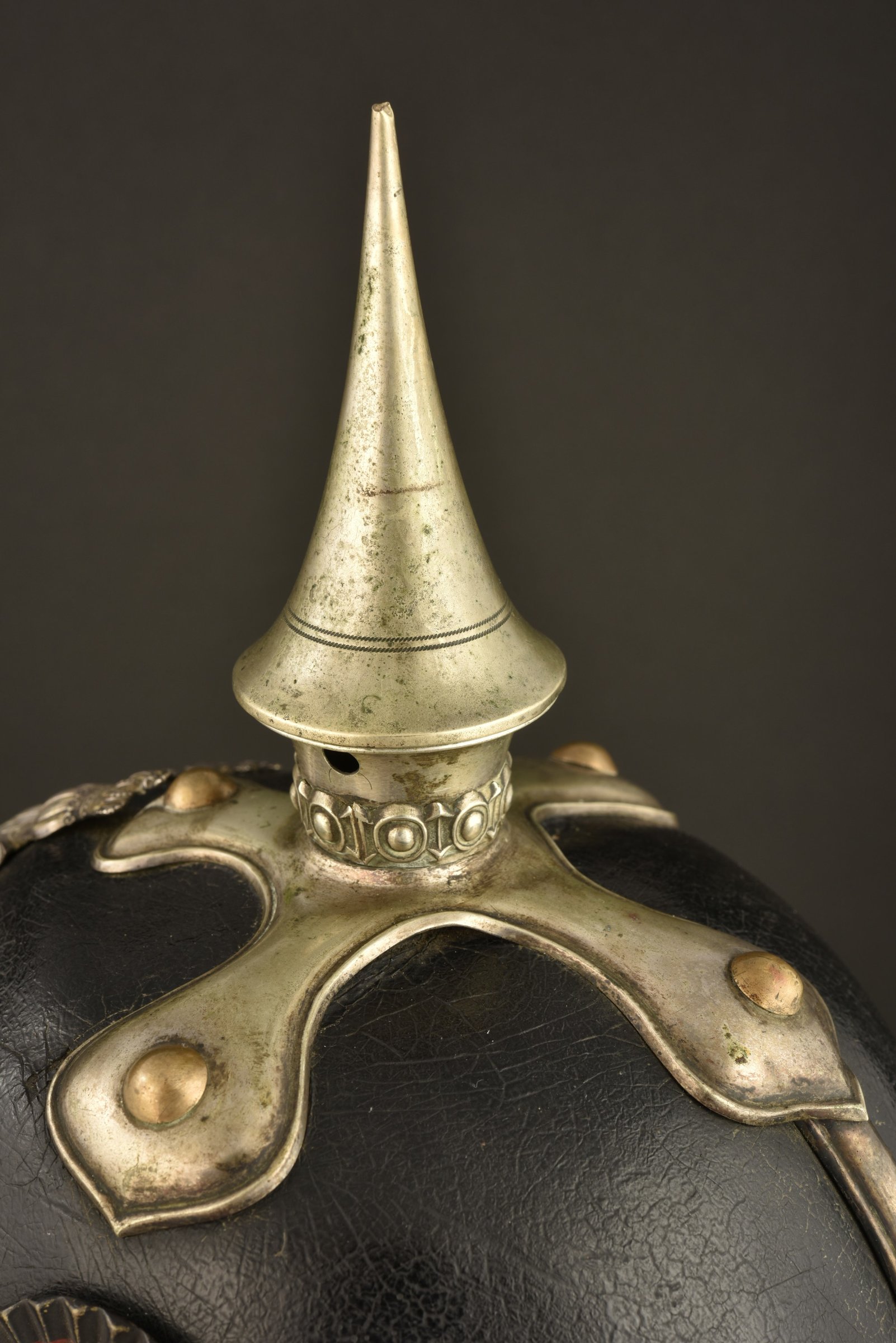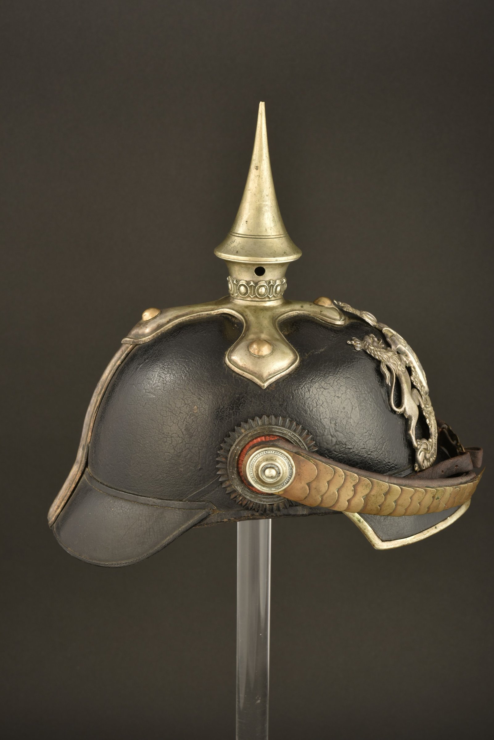 Casque à pointe d’achat privé, Eigentum, pour un sous officier supérieur ou un aspirant dans un régiment de Grenadier du Wurttemberg. Le 119ème ou le 123ème. Toutes garnitures maillechort. Pointe type officier, dévissable, emabse fixée par rivets à têtes rondes. Bonnes cocardes d’officier dont la Wurttemberg plissée noir et rouge. Jugulaires à écailles plates en laiton, fixées par rosaces maillechort à vis. Plaque aux armes du Wurttemberg en maillechort, à pattes repliables. Les bois du cerf sont absent. à noter 2 petits trous sur les armoiries, sans doute pour une croix de Reserve, ici absente. Coiffe type sous officier en cuir à dents de loup carrées.