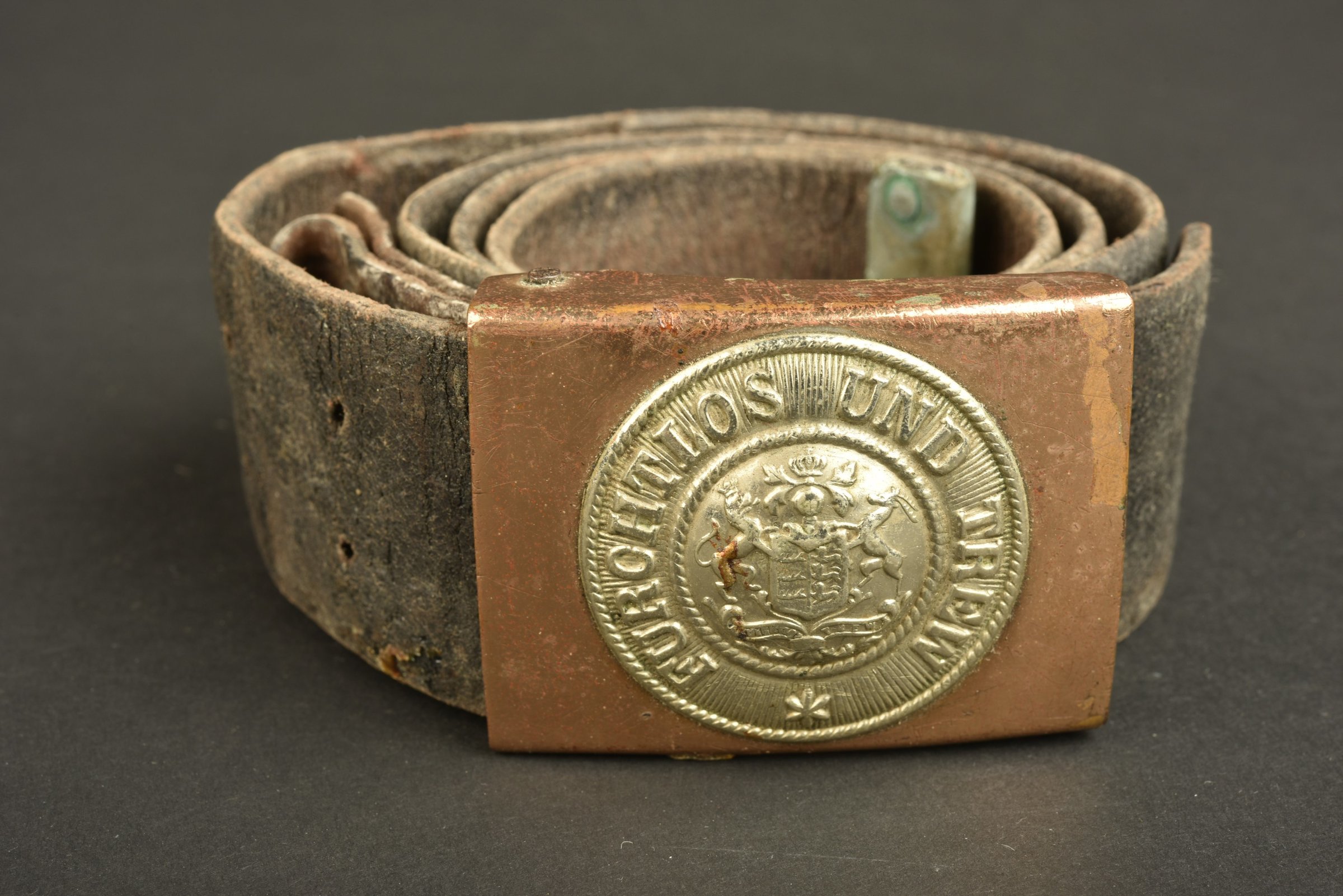 Ceinturon en cuir avec crochet type foyer, manque la contre patte de réglage, en état très moyen. Boucle Wurttemberg modèle 1895 de foyer en tombac ou cuivre rouge, marquée Wurttemberg au... en savoir plus
