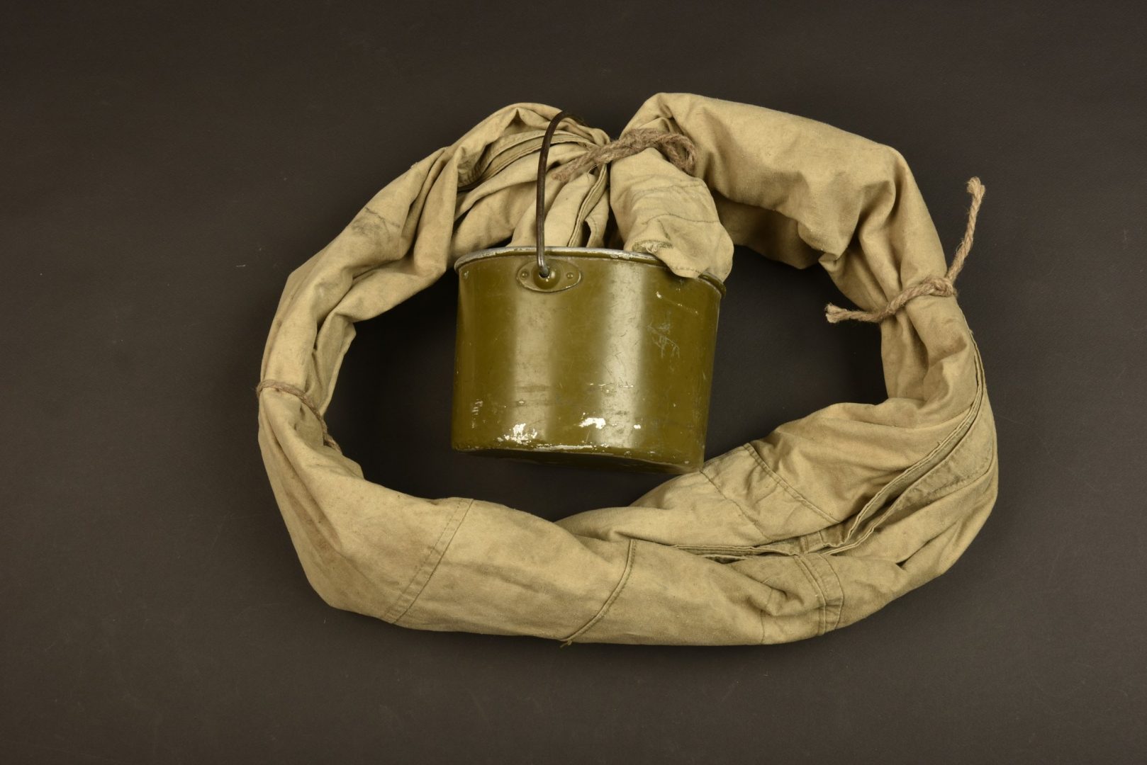 Comprenant une toile de tente en tissu gis, les cordelettes sont postérieures. Nombreuses tâches, marques d’usure et quelques accrocs. Une gamelle en aluminium, anse complète, peinture à... en savoir plus