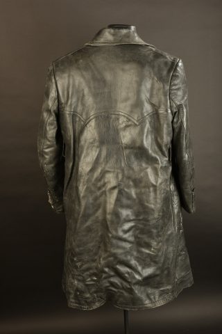 En cuir noir, la majorité des boutons sont présents. Nombreuses réparations et manques. Intérieur doublé en drap noir. Pattes de col de l’aviation russe montées main. Nombreuses réparations. A noter une forte usure et patine de la pièce, ainsi que des manques et des tâches. Provenance du Musée de la Seconde Guerre Mondiale à Tosny en Normandie. Collection Jean Erisay. Etat II+.