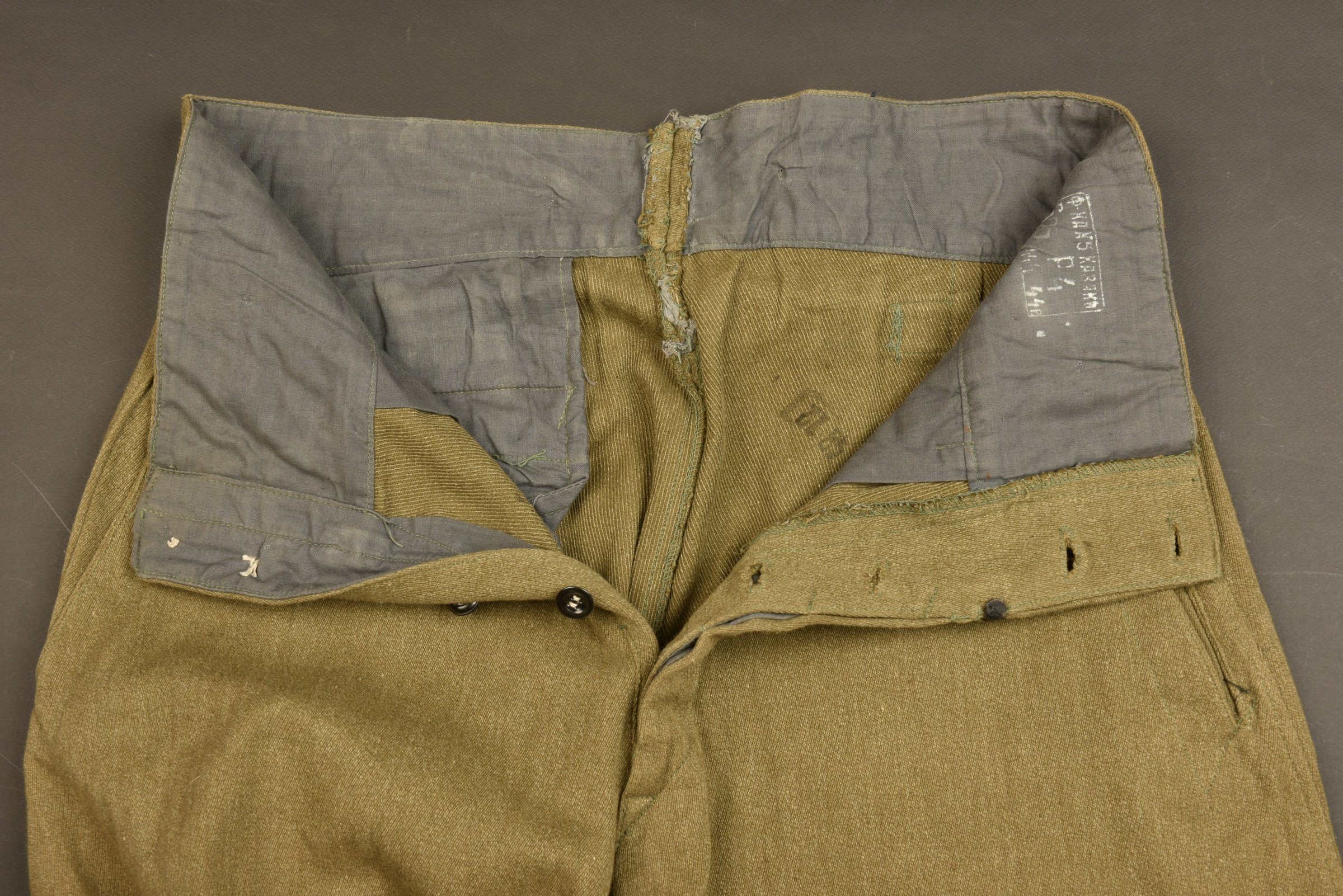 En tissu coton marron. Tous les boutons sont présents. Les boutons au bas des jambes sont manquants. Intérieur doublé en tissu coton gris/bleu. Marquages présents et datés 1944. A noter une... en savoir plus