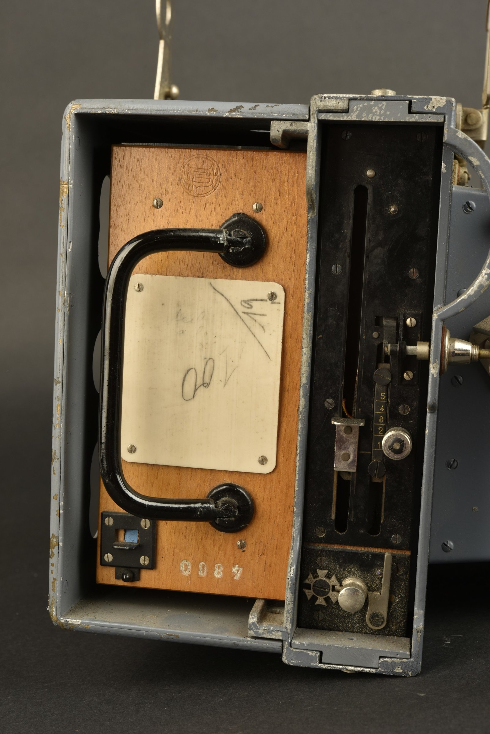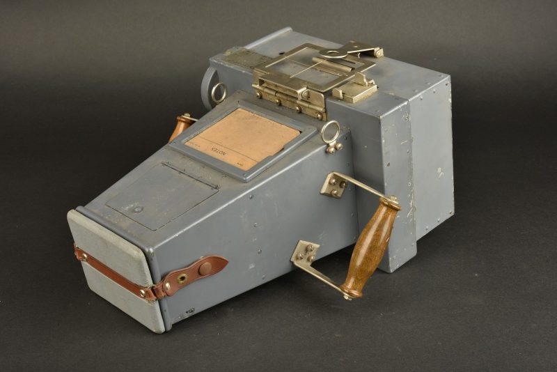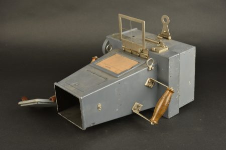 En métal léger, couleur bleu ciel à 90%, deux poignées latérales avec gâchettes, plaquettes marquées Appareil 13×18-225 Modèle 1918 N°100. Tiroir contenant un fil, toutes les pièces... en savoir plus