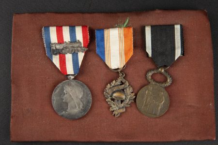 Comprenant 12 médailles dont trois croix de guerre 14-18, une commémorative 1870-71, une médaille militaire, une médaille du travail et sa réduction, une médaille de l’aéronautique... en savoir plus