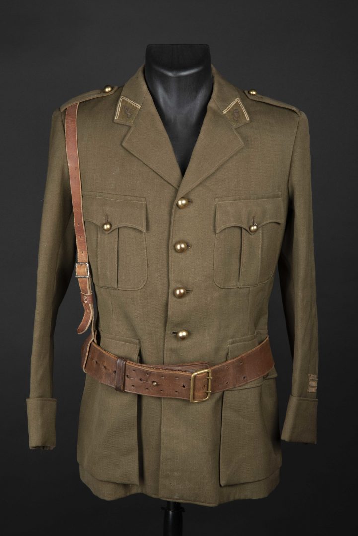 En drap peigné fermant par quatre boutons lisses dorés, grades de capitaine cousus d’origine au bas de manches. Pattes de col deux soutaches blanches, grenade dorée brodée cannetille,... en savoir plus