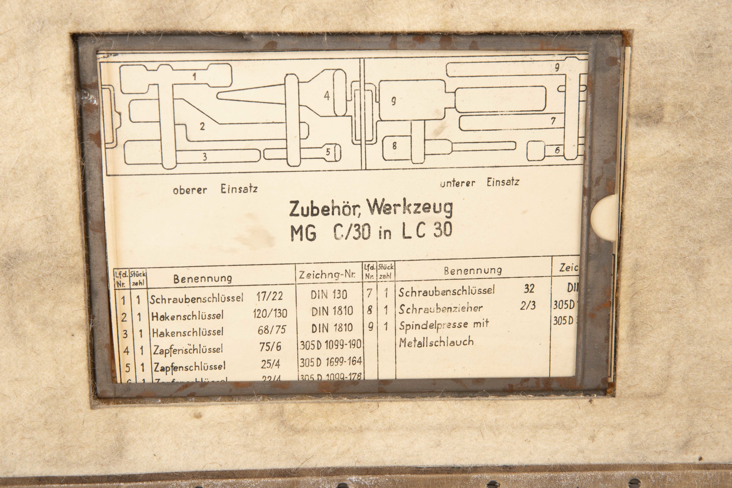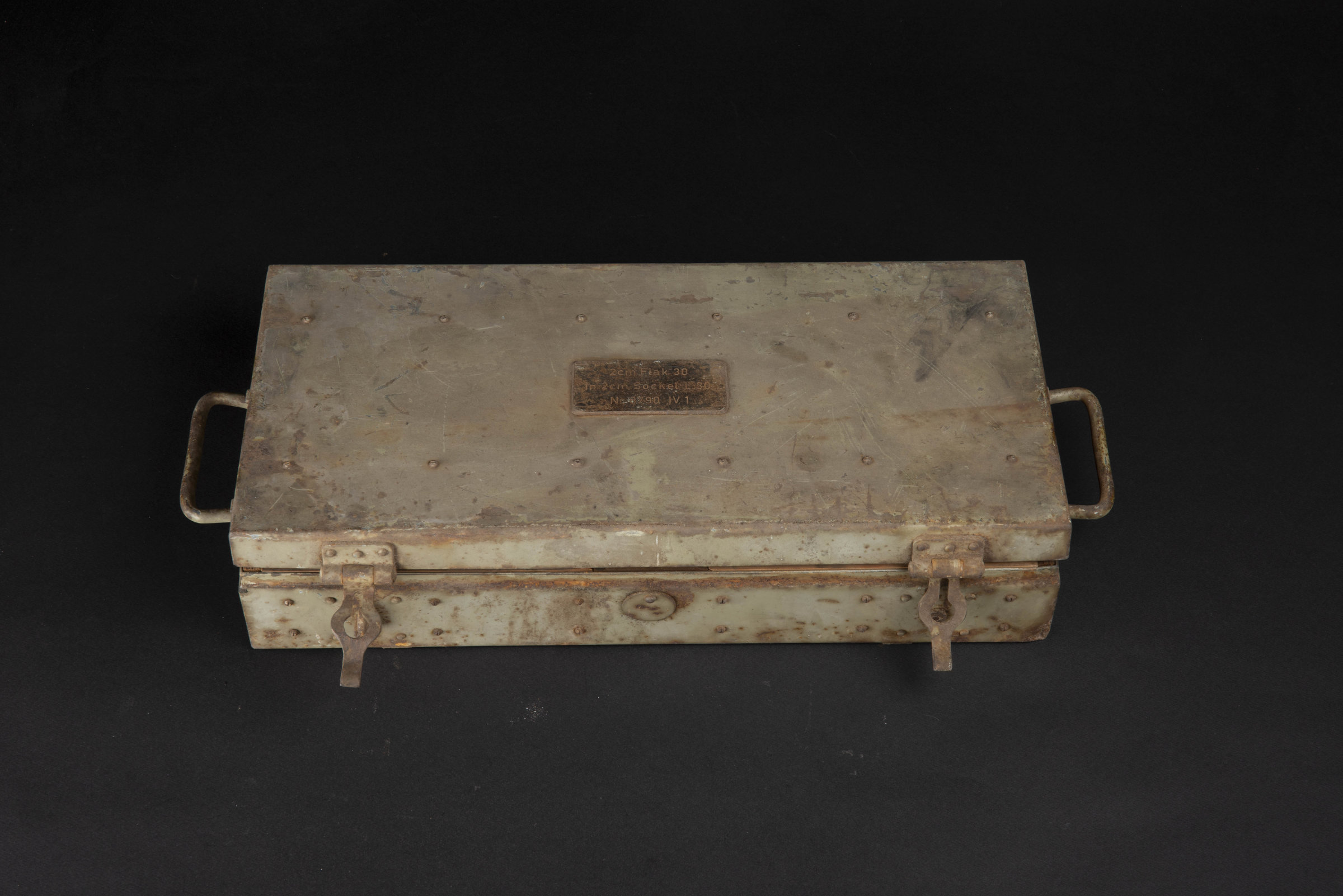 Caisse en métal, peinture à 60%. Poignées de transport présentes. Un crochet de fermeture manquant. Plaquette du couvercle marquée 2 cm Flak 30 in 2 cm Sockel L30 NR 8790 IV.1. Notice... en savoir plus