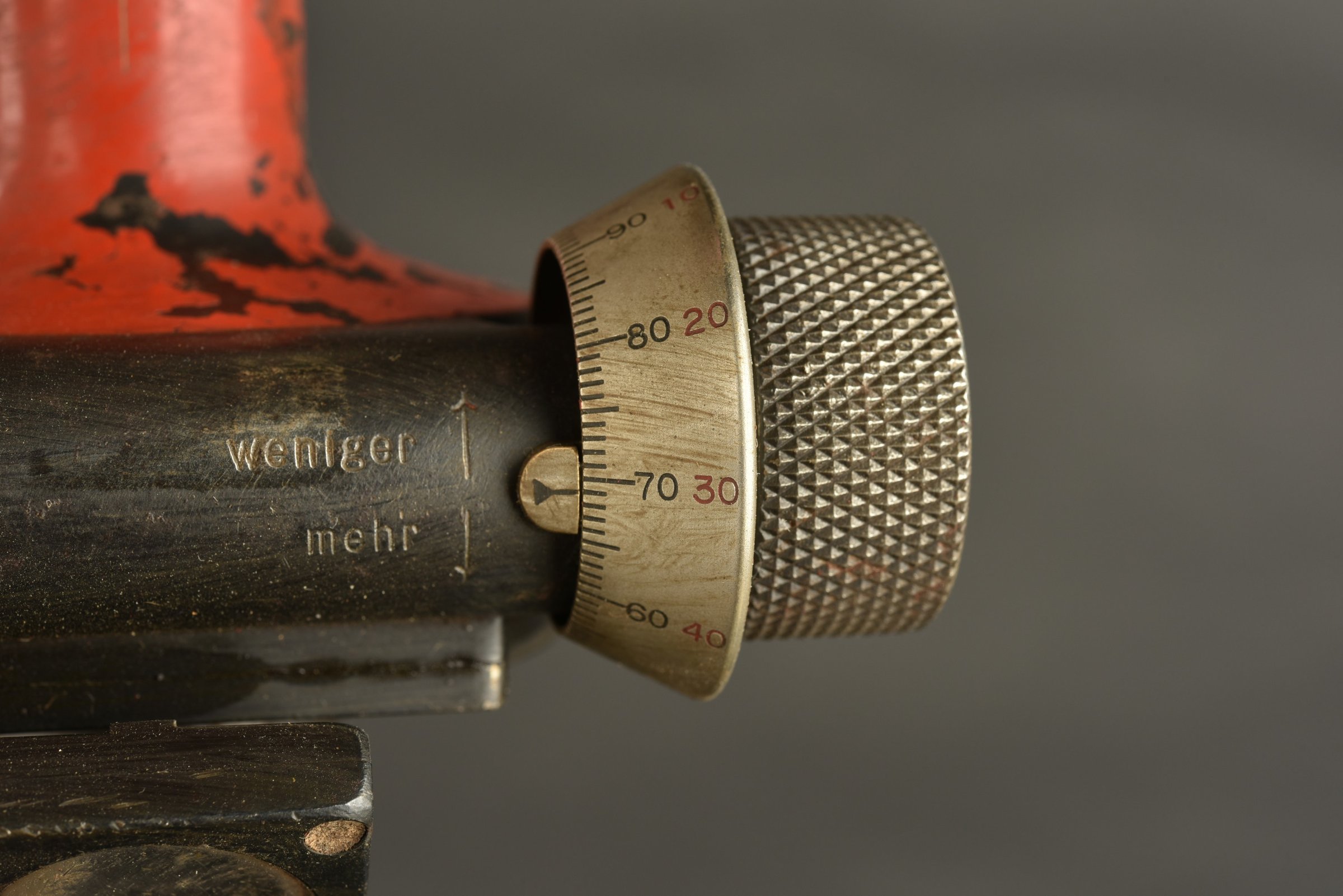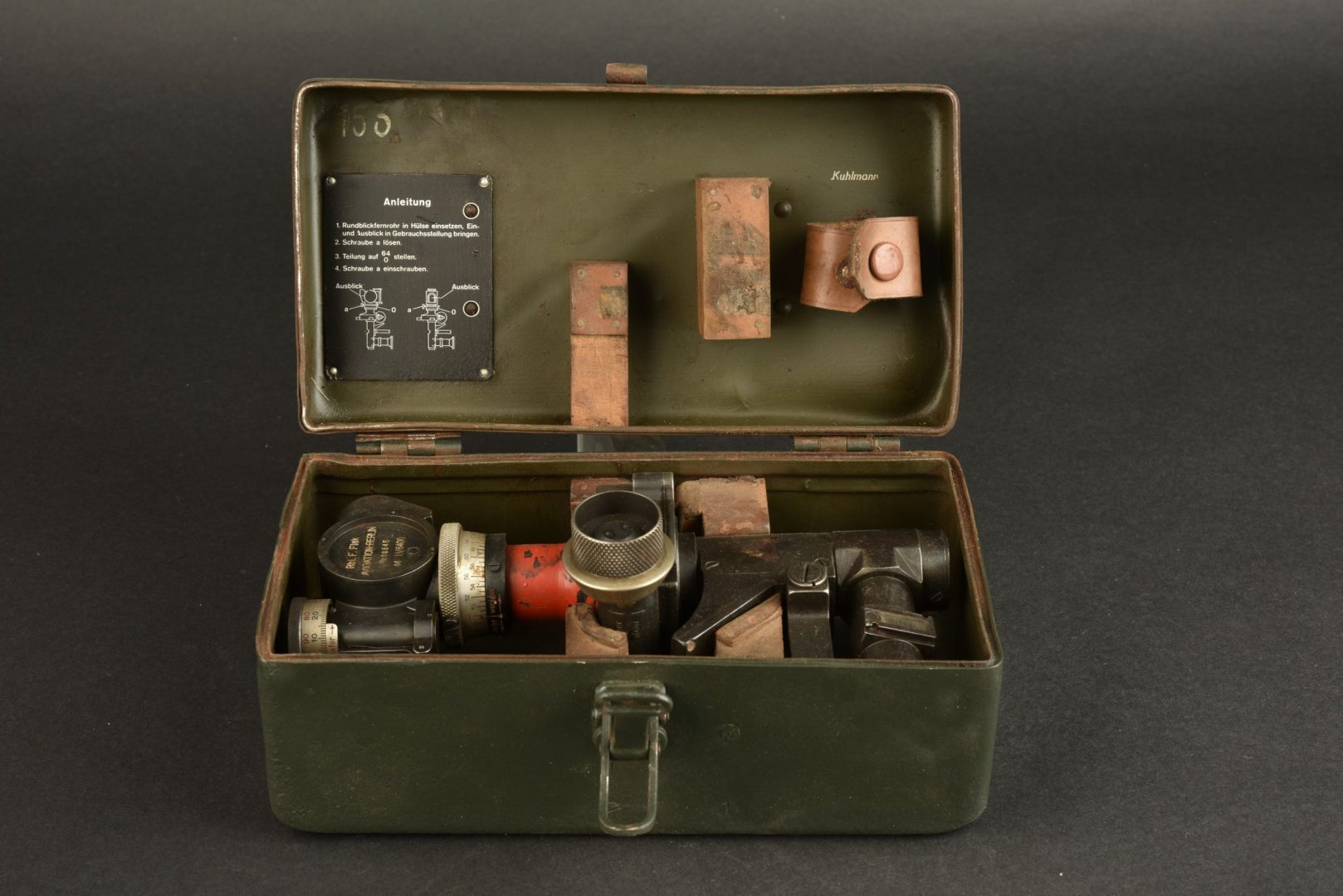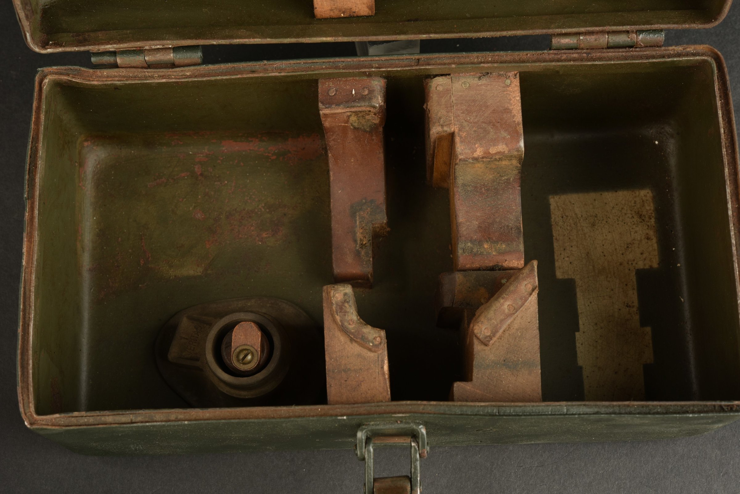Boite en métal, le crochet de fermeture est complet. Repeinte, couvercle fortement bosselé. Intérieur en peinture d’origine, disposant de toutes ses cales. Plaquette d’instruction... en savoir plus