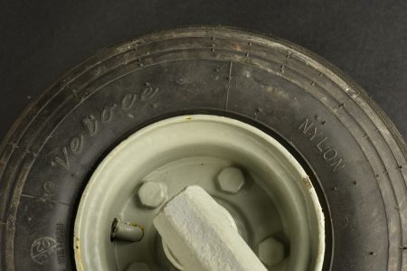 Pneu en caoutchouc, marqué Veloce, fabriqué au Vietnam. Dimension 300-4. Support en métal présent. Couleur gris bateau. A noter une certaine usure et patine de la pièce. Provenance du Musée... en savoir plus