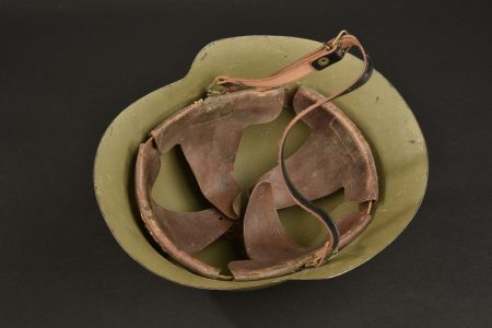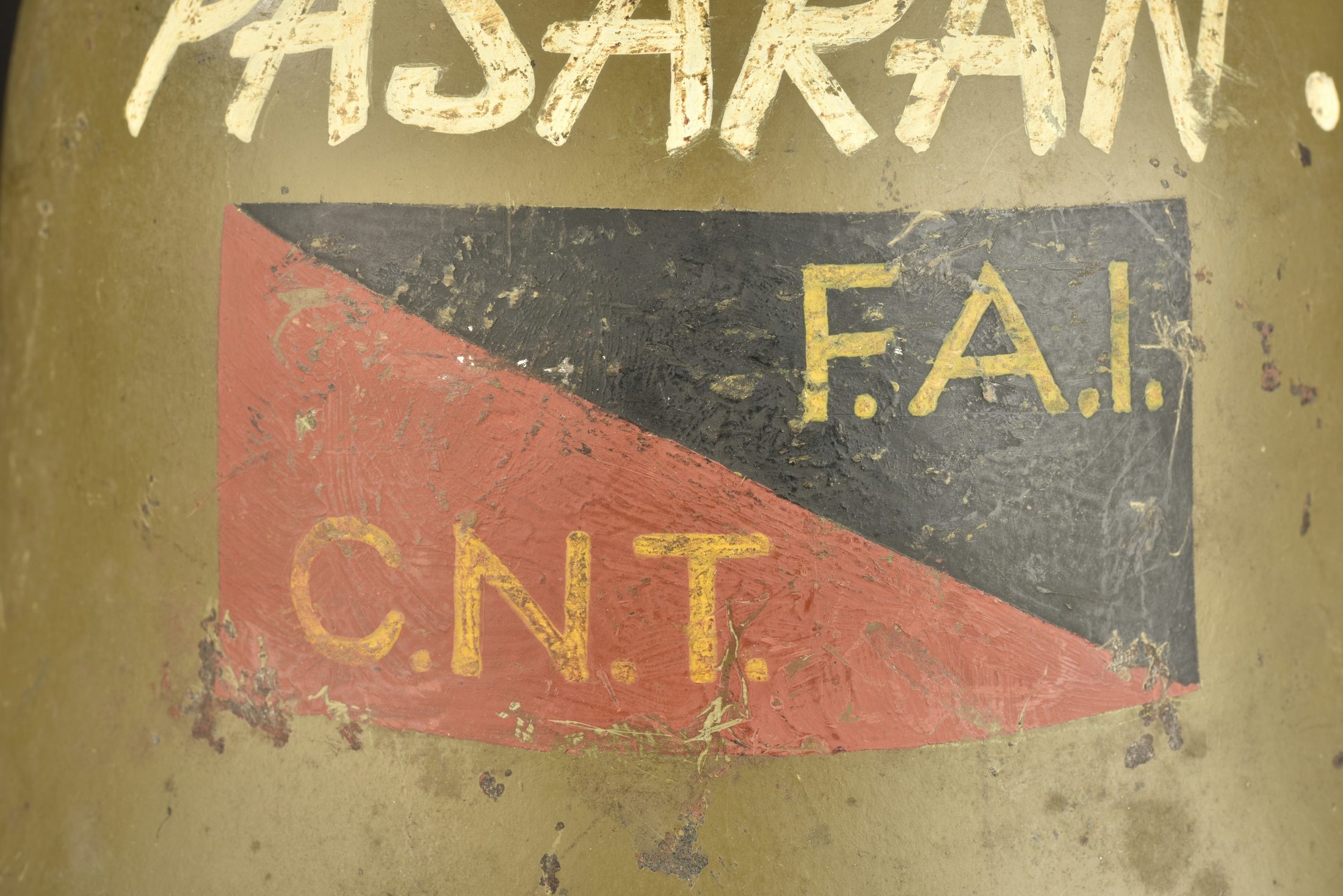 Casque espagnole. Modèle 34. Coque en métal. Peinture à 70%. Face avant marquée NO PASARAN !, insigne peint CNT FAI. Coiffe en cuir présente, cordon de serrage manquant. Jugulaire complète.... en savoir plus